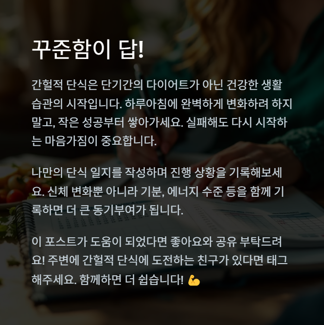여러분, 간헐적 단식은 단순히 식사 시간을 조절하는 걸 넘어서 내 몸과 마음을 더 잘 이해하게 되는 여정이에요. 매번 실패했다고 해서 좌절하지 마세요. 오늘 이야기한 3가지, 혹은 6가지 이유만 잘 기억해도 훨씬 수월하게 지속할 수 있습니다. 건강한 습관은 언제나 천천히, 나에게 맞는 속도로 자리 잡는 법이니까요.