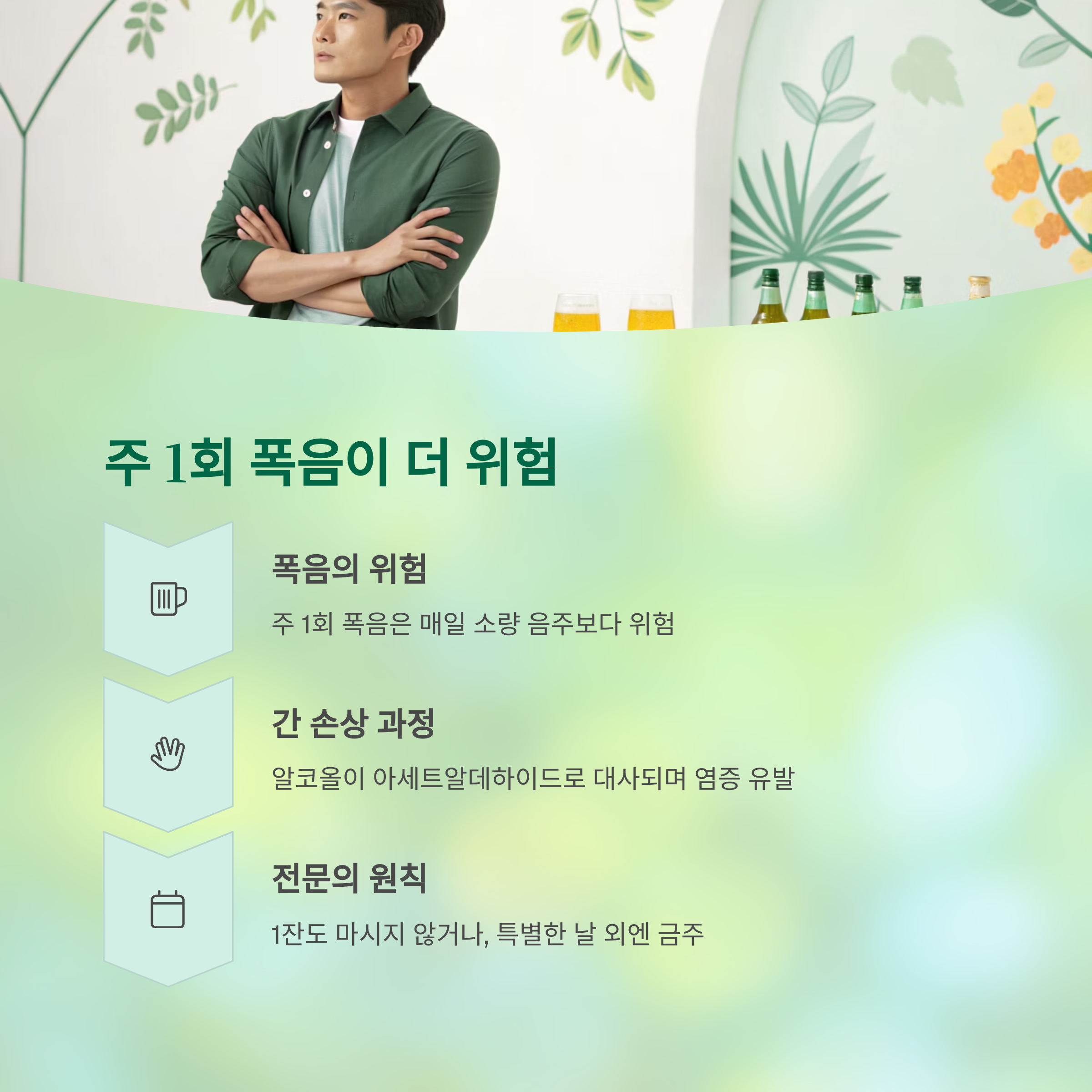 주 1회 폭음은 매일 소량 음주보다 간 손상 위험이 더 큽니다.