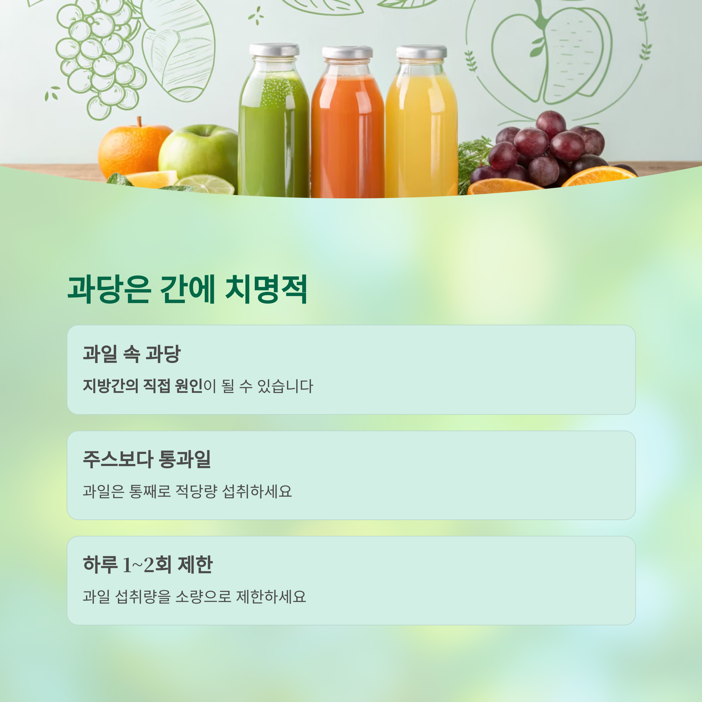 | 식습관 | 과일주스, 과당 음료, 폭식 | 천연 과일 소량, 규칙적 식사 |