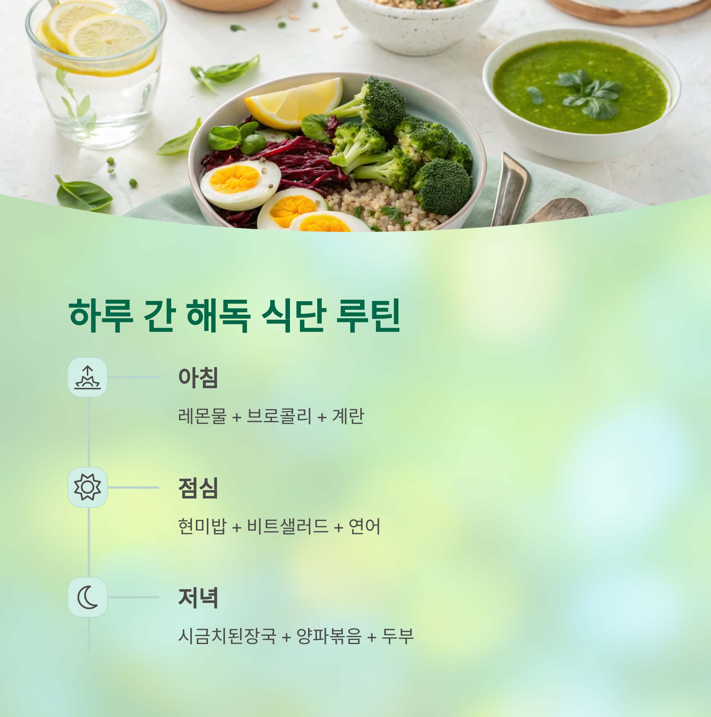 | 아침 | 레몬물+브로콜리+계란 | 해독 효소 활성화, 단백질 공급 |