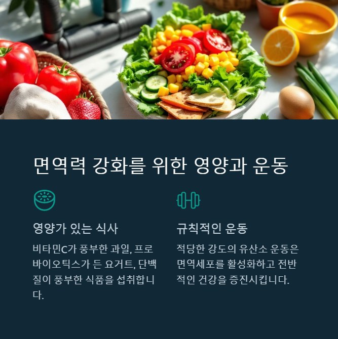 비타민C가 풍부한 과일, 항산화 성분이 많은 채소, 프로바이오틱스가 들어 있는 요거트 등을 섭취하면 면역력 강화에 도움이 됩니다.