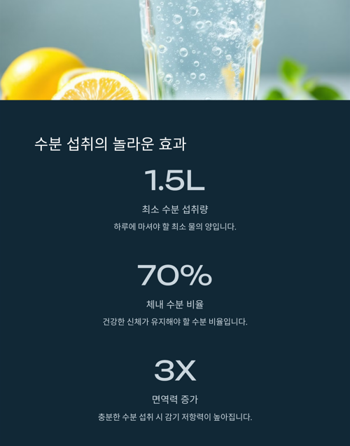 물을 충분히 마시는 것은 감기를 예방하는 중요한 습관이에요. 체내 수분이 부족하면 점막이 건조해져 바이러스가 침투하기 쉬워져요.