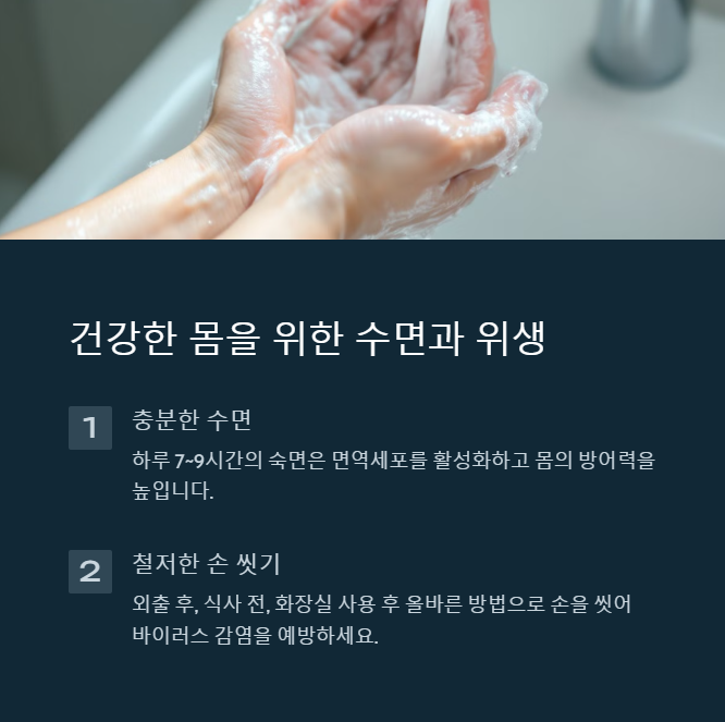 숙면을 취하는 것은 면역력을 높이는 가장 기본적인 방법이에요. 하루 7~9시간의 수면을 유지하면 몸이 충분히 회복되고 면역 체계가 강화됩니다. 특히 깊은 수면 상태에서는 감염을 예방하는 면역세포가 활성화된다는 연구 결과도 있어요.잠을 충분히 못 자면 우리 몸의 방어력이 약해져 감기에 쉽게 걸릴 수 있어요.