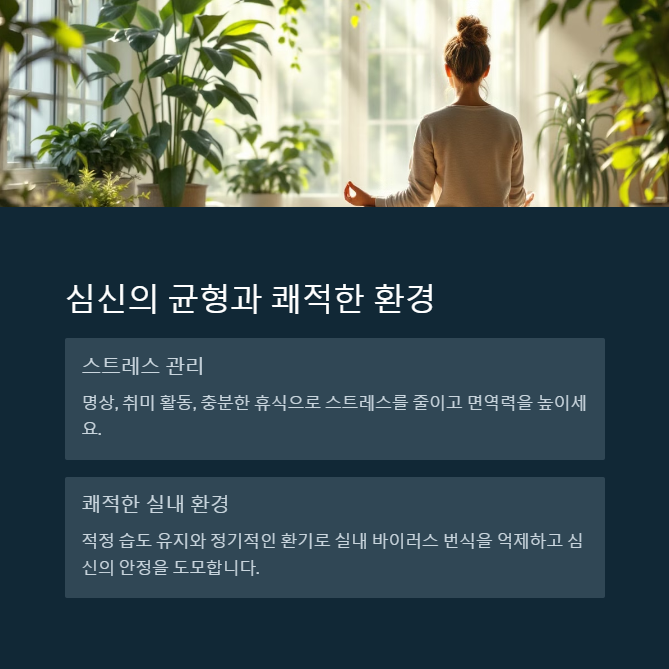 운동을 너무 과하게 하면 오히려 면역력이 떨어질 수 있으니, 가벼운 조깅, 스트레칭, 요가 같은 운동을 꾸준히 하는 것이 좋아요.