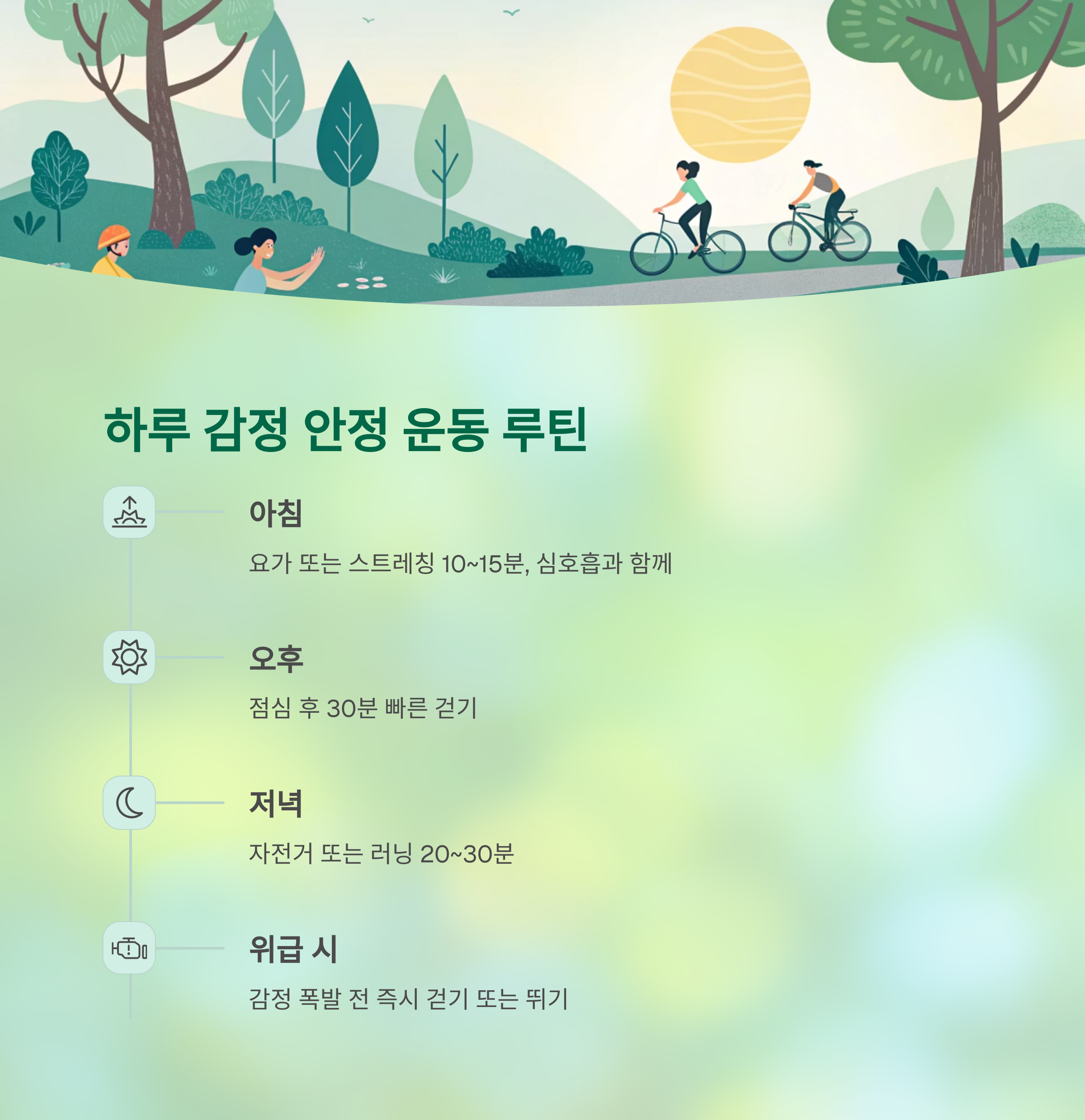 | 분노 폭발 | 고강도 인터벌 걷기 | 자율신경 이완, 반사적 반응 억제 |