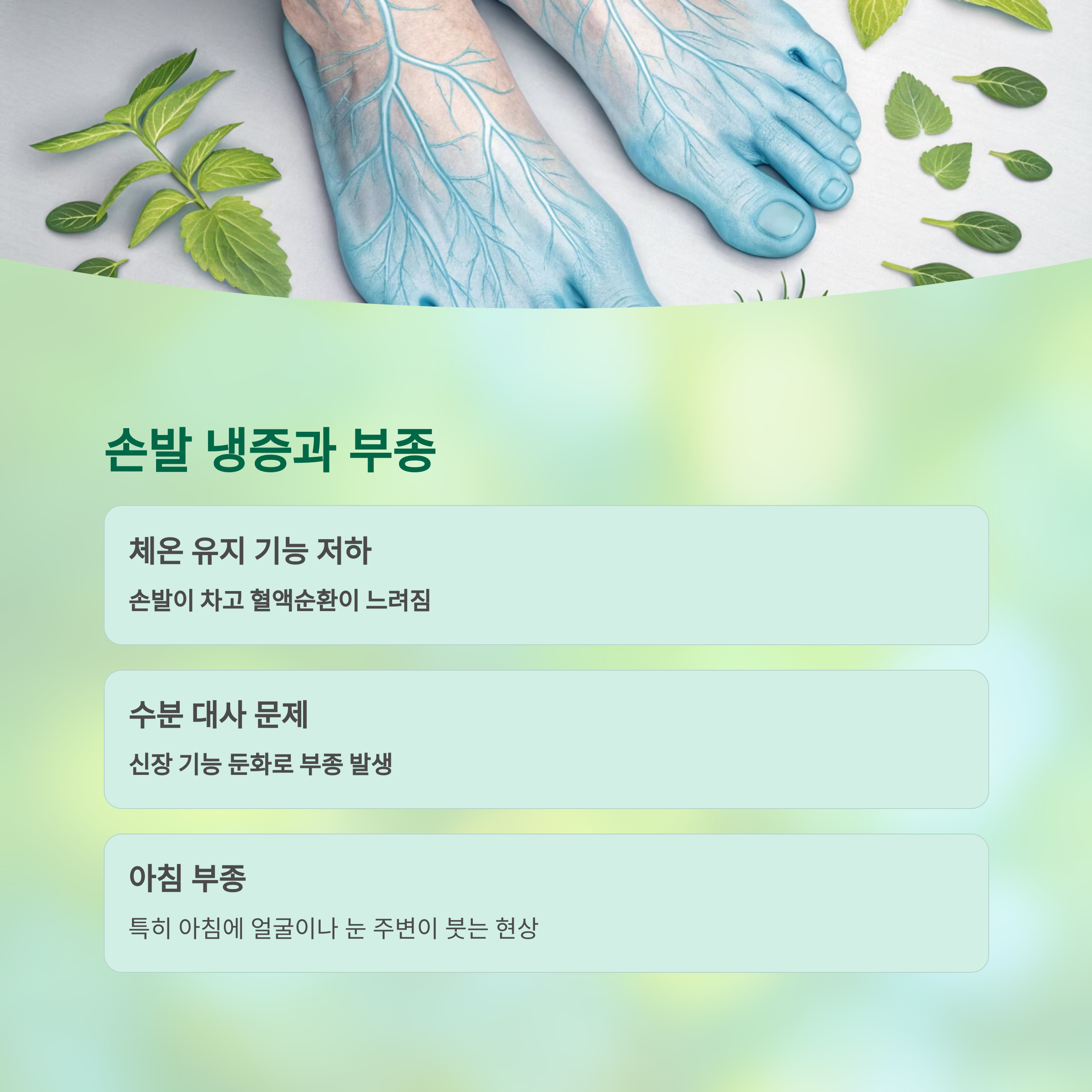 | 손발 냉증, 부종 | 순환 저하, 수분 정체 | 호르몬 대사 둔화 |