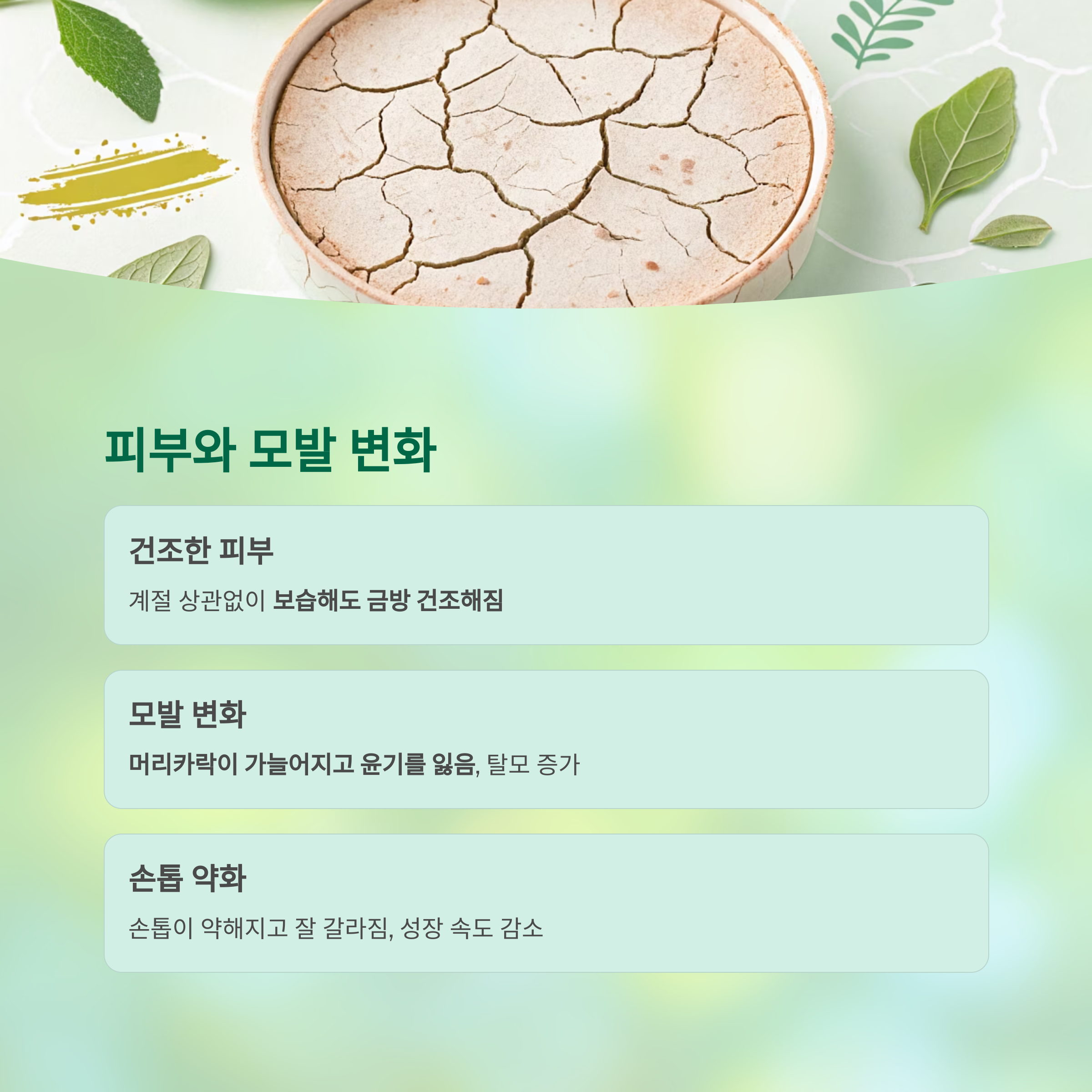 | 피부/모발 변화 | 건조, 탈모 | 재생 주기 둔화 |