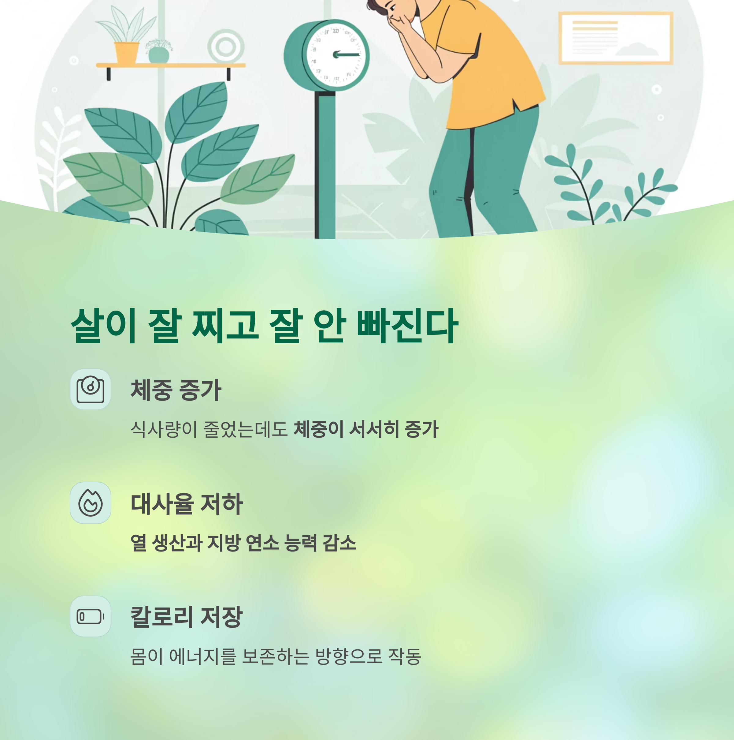 | 체중 증가 | 식사량과 무관 | 기초대사 감소 |