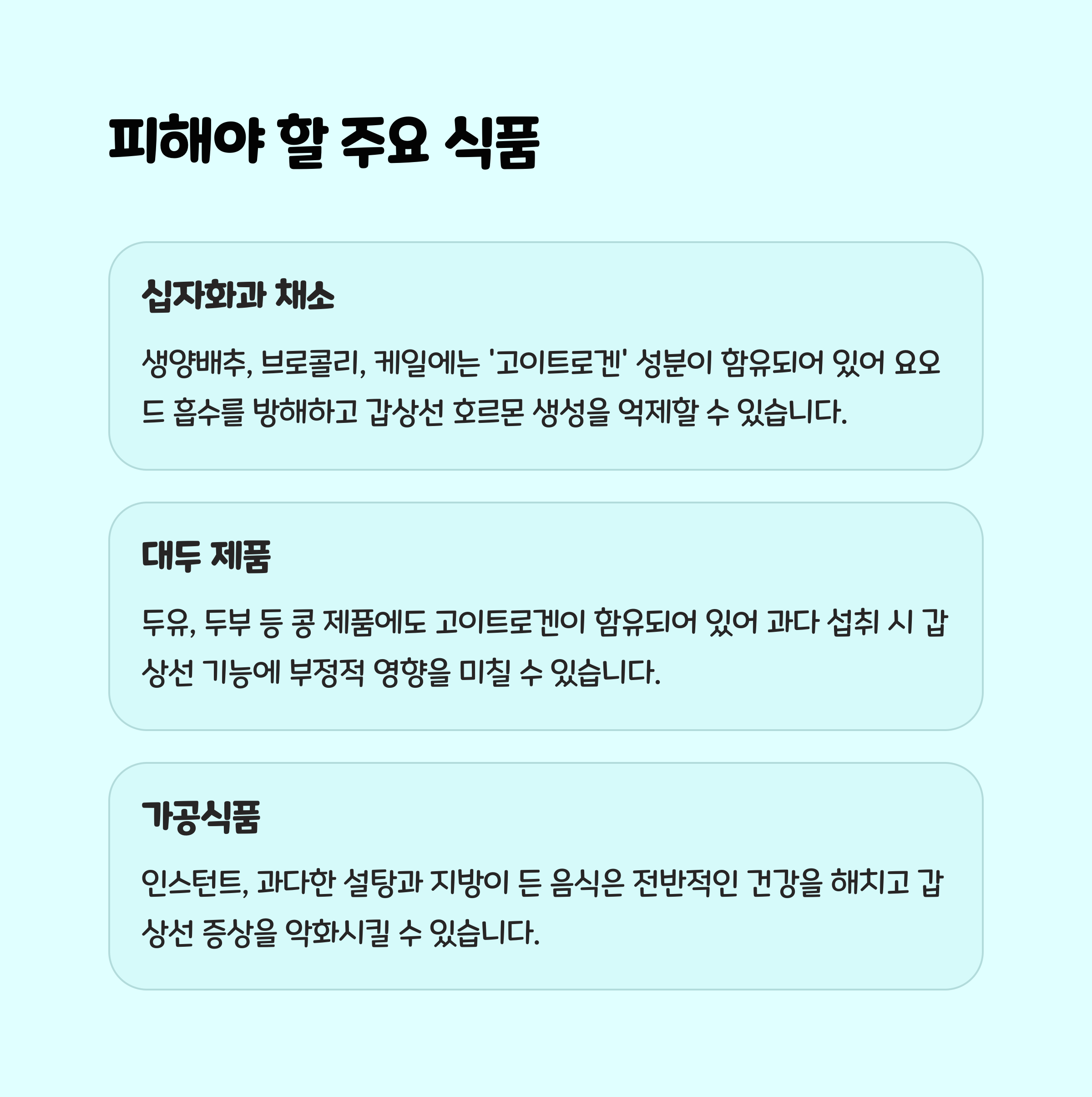 | 대두 제품 (두유, 두부) | 요오드 흡수 방해 가능 | 과다섭취 주의 |