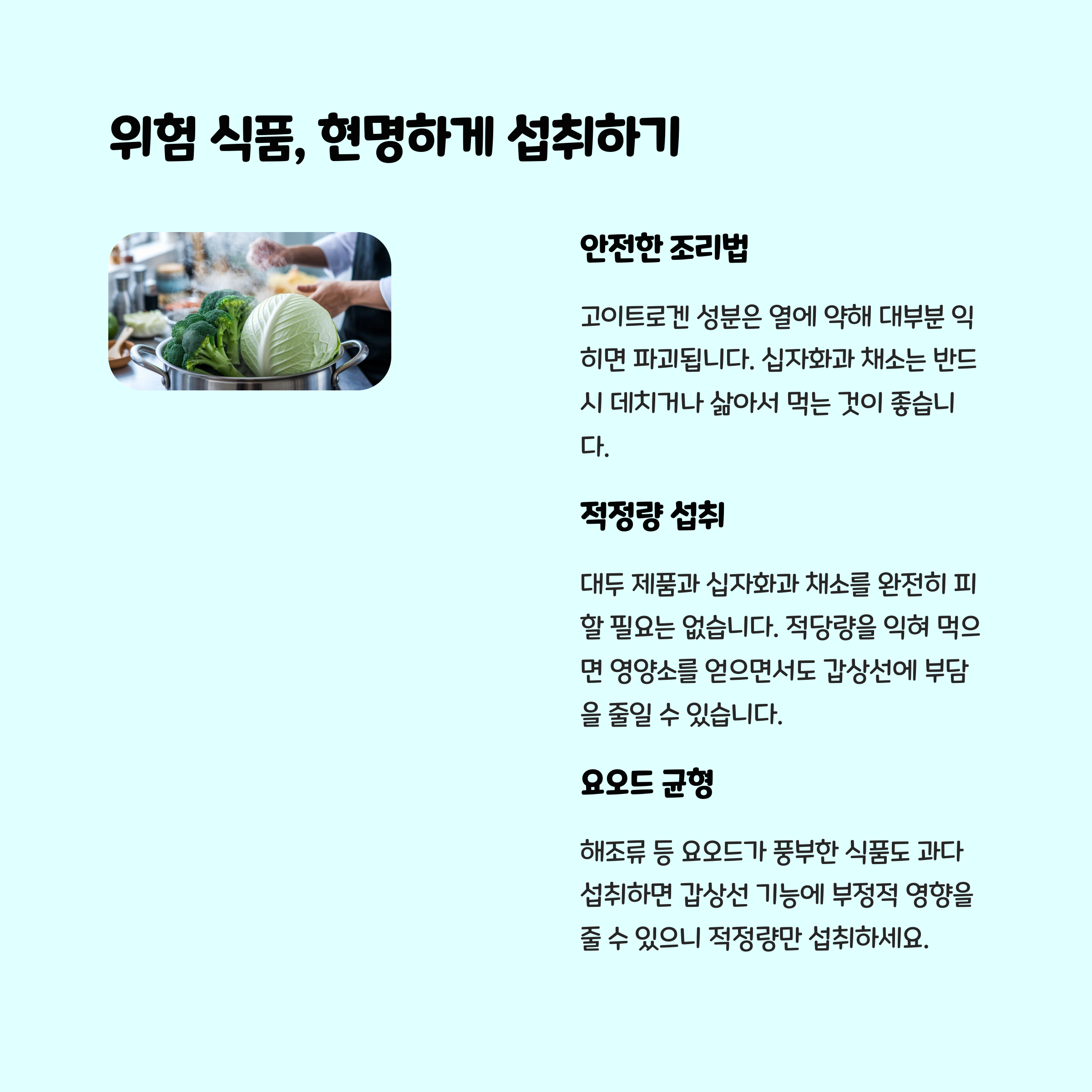 | 날 생양배추, 브로콜리 | 갑상선 호르몬 생성 억제 | 익혀 먹으면 영향 감소 |