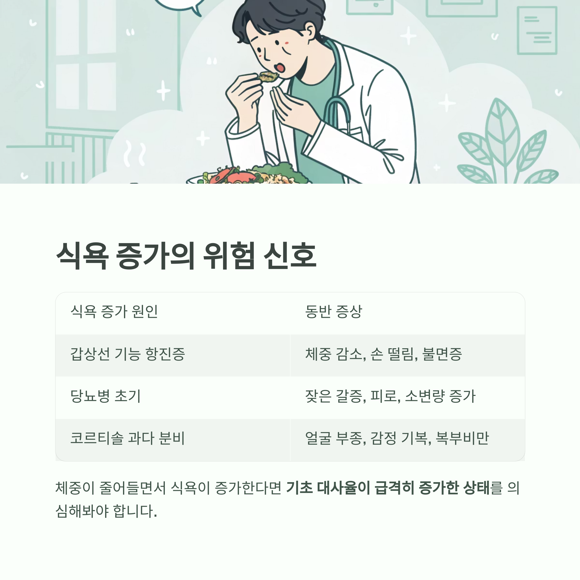 갑자기 식욕이 많아지는 현상은 단순한 다이어트 실패가 아니라, 당뇨 초기, 갑상선 기능 항진증과 같은 질환 신호일 수 있습니다.