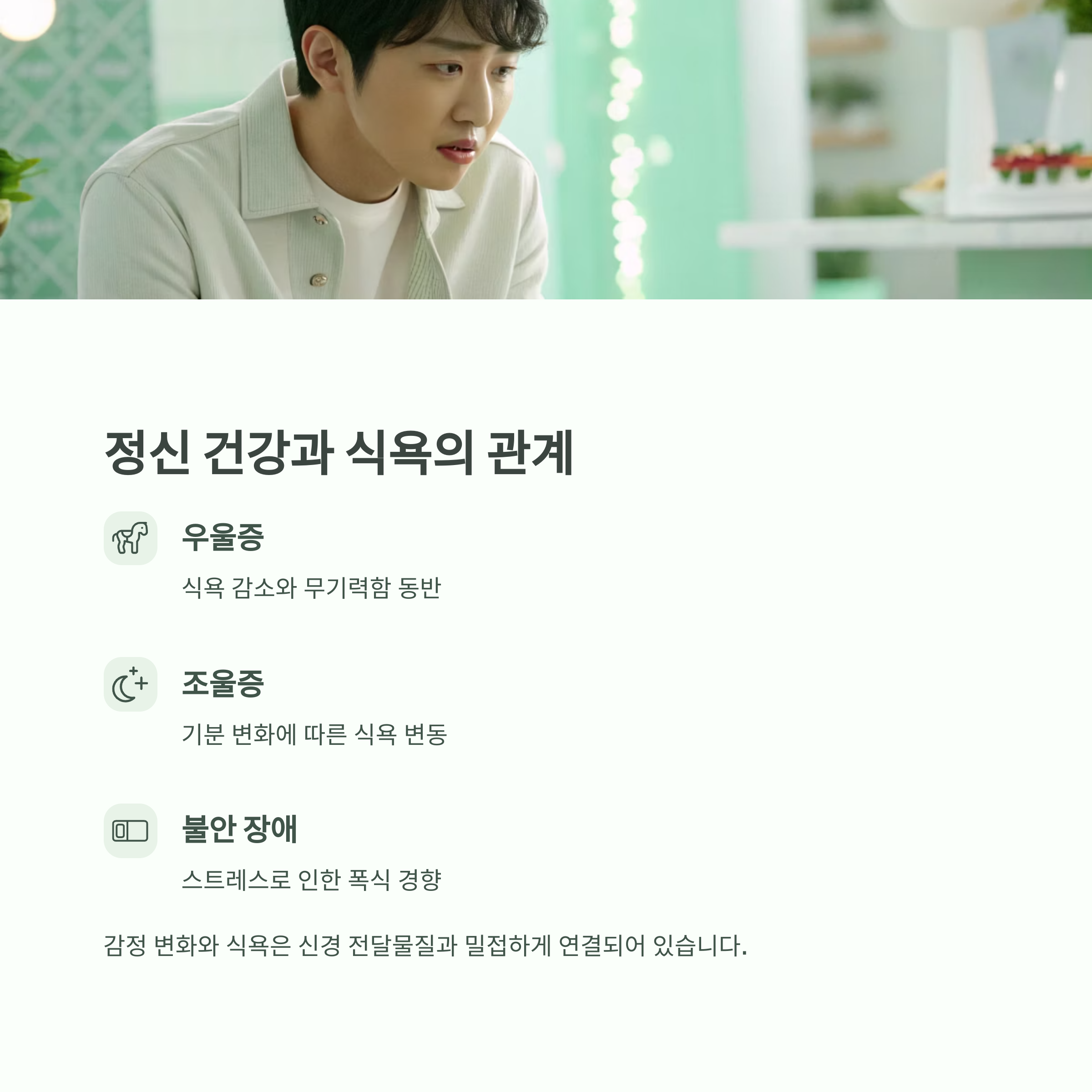 우울증은 대표적인 식욕 감소 질환이고, 조울증이나 불안 장애는 식욕을 증가시키는 경우가 많습니다.