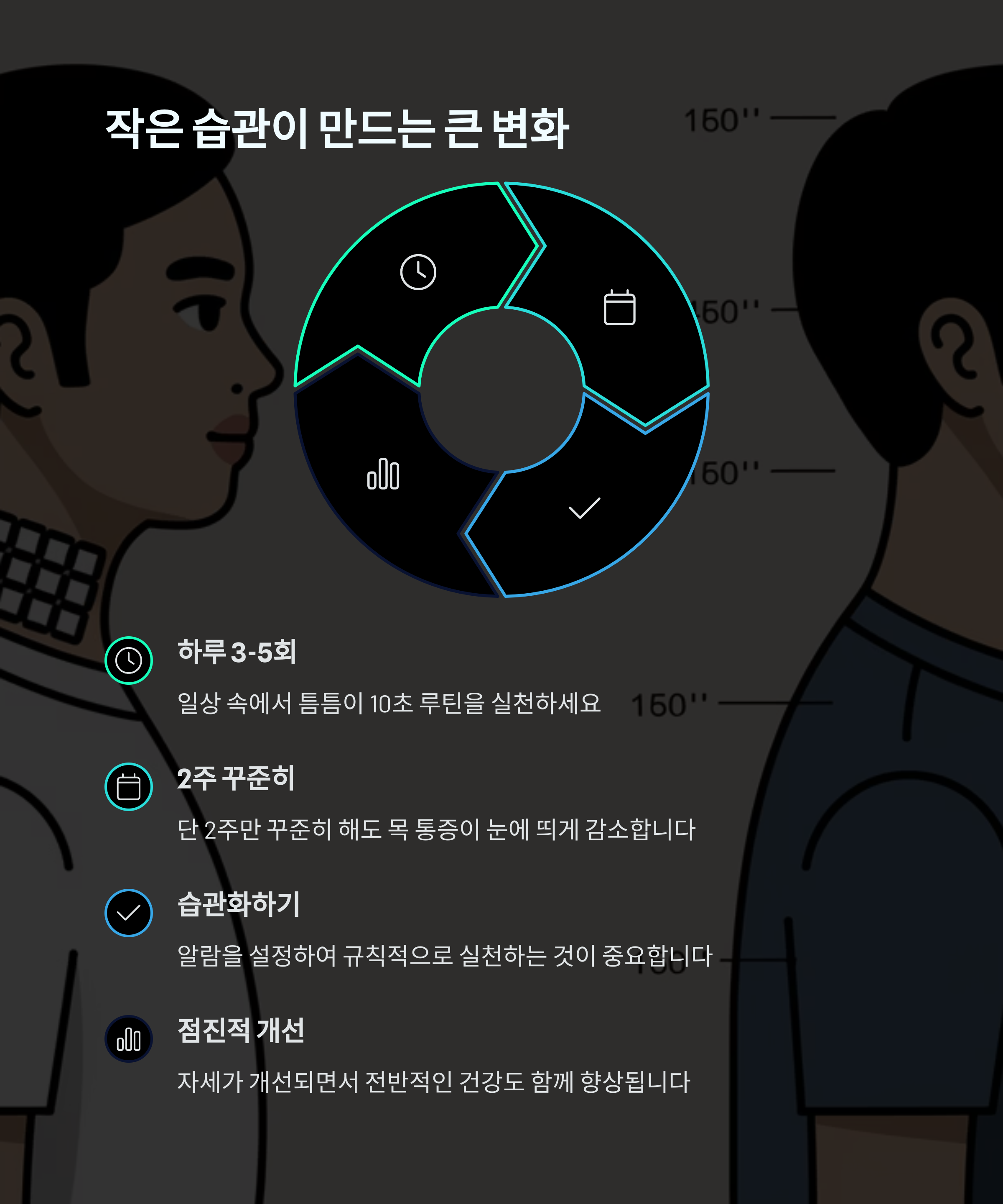 첫날부터 뻐근함이 줄어들 수 있지만, 완전한 자세 변화는 2~3주 이상 꾸준히 해야 느껴져요.