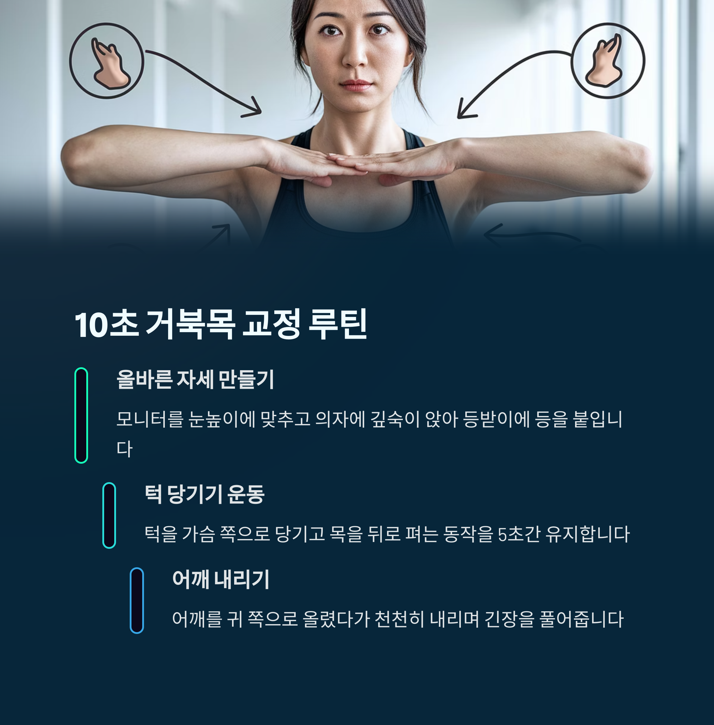정말 간단해요. 이 동작 하나만 기억하세요: 턱 당기기 + 어깨 내리기. 의자에 똑바로 앉은 상태에서, 턱을 살짝 안으로 당기고, 어깨는 위에서 누르는 느낌으로 지그시 아래로 내려주세요.
