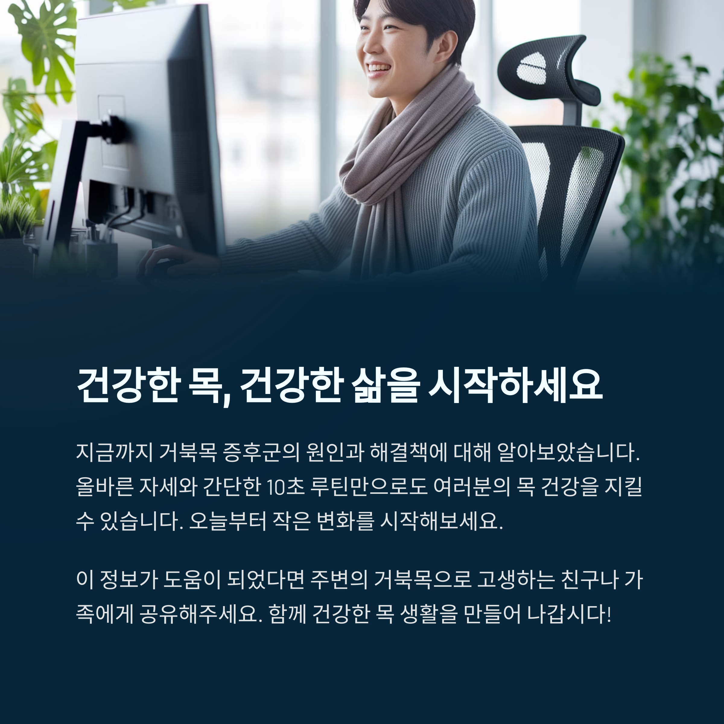 거북목이 단순히 보기 안 좋은 문제만은 아니란 거, 이제 아시겠죠? 우리 몸은 연결돼 있어요. 목이 틀어지면 등, 어깨, 심지어 허리까지 영향이 퍼진답니다. 저는 매일 아침 눈뜨자마자 10초 루틴을 먼저 해요. 그럼 하루 종일 목이 한결 가볍고, 자세도 자연스럽게 곧게 유지되더라고요. 여러분도 오늘부터 단 10초만 투자해 보세요. 몸이 달라지면 삶도 달라질 거예요!