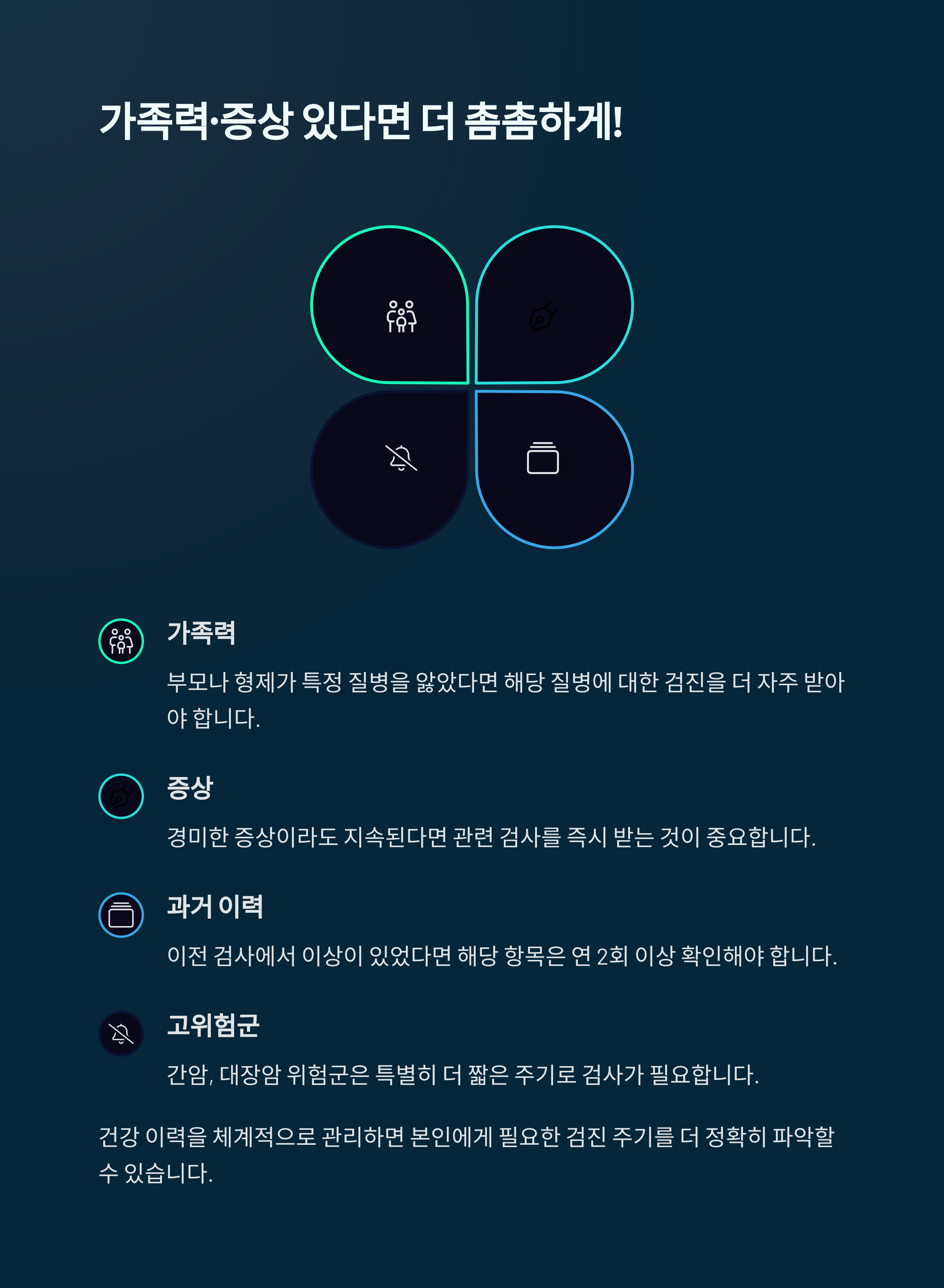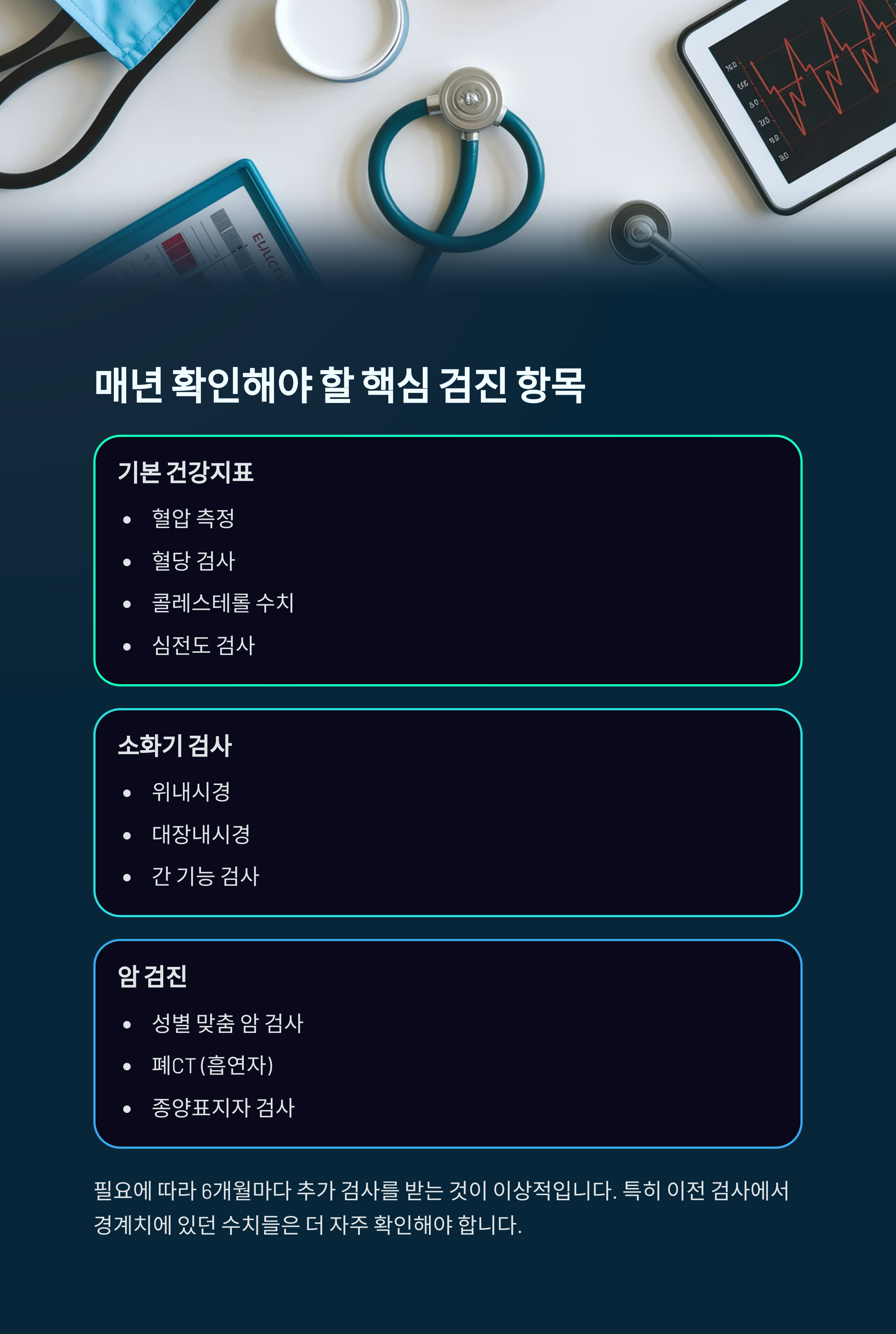 | 50대 이상 | 대장내시경, CT, 골밀도 검사 | 6개월~1년 |