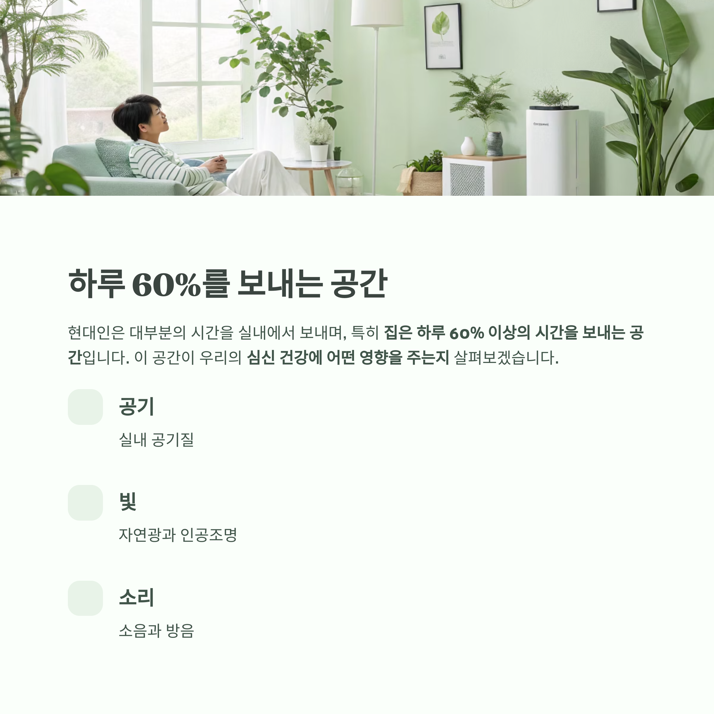 현대인의 생활은 대부분 실내에서 이루어지고 있으며, 특히 집은 하루 60% 이상의 시간을 보내는 공간입니다.