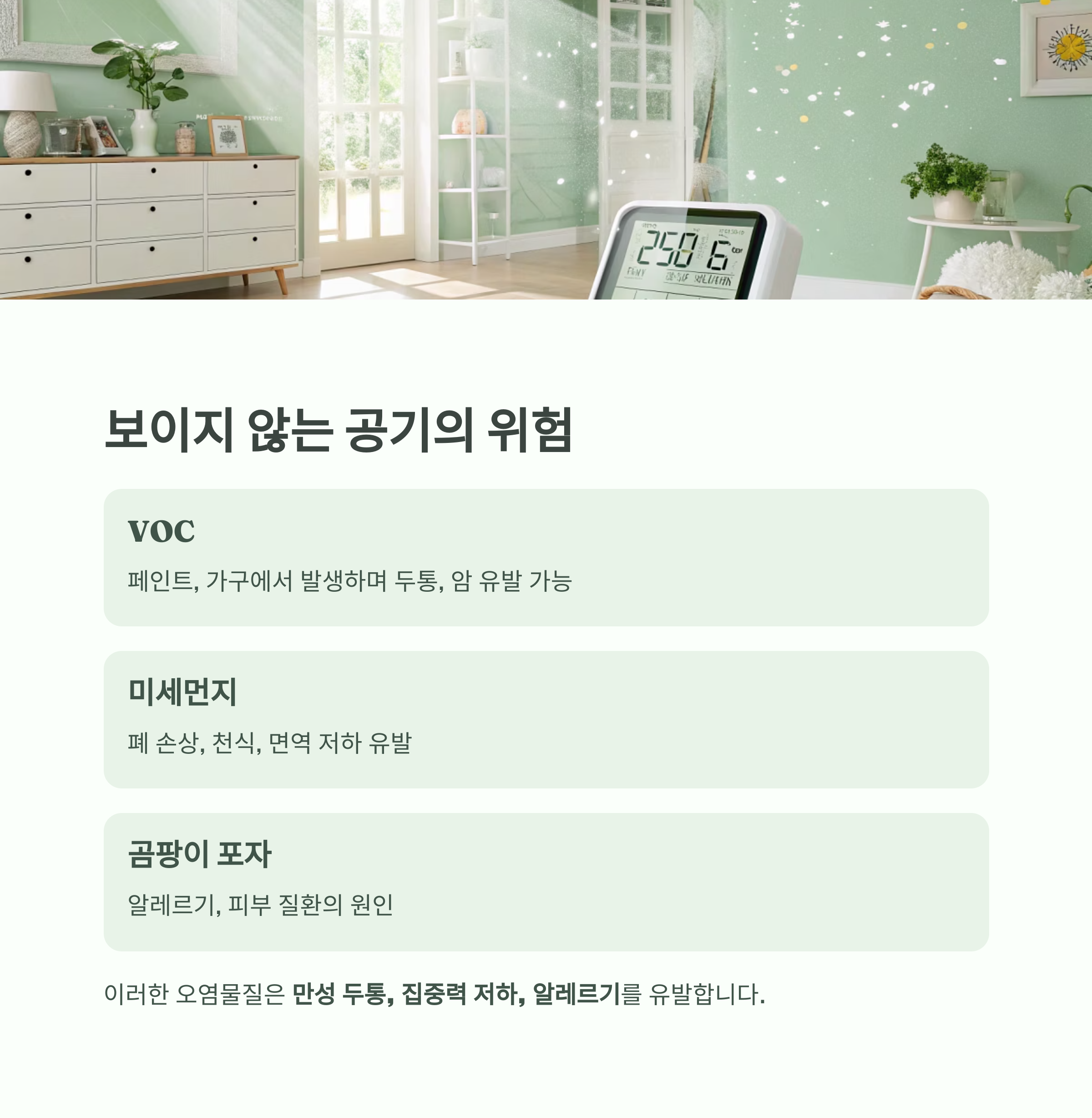호흡기 질환뿐 아니라 만성 두통, 집중력 저하, 알레르기를 유발합니다.