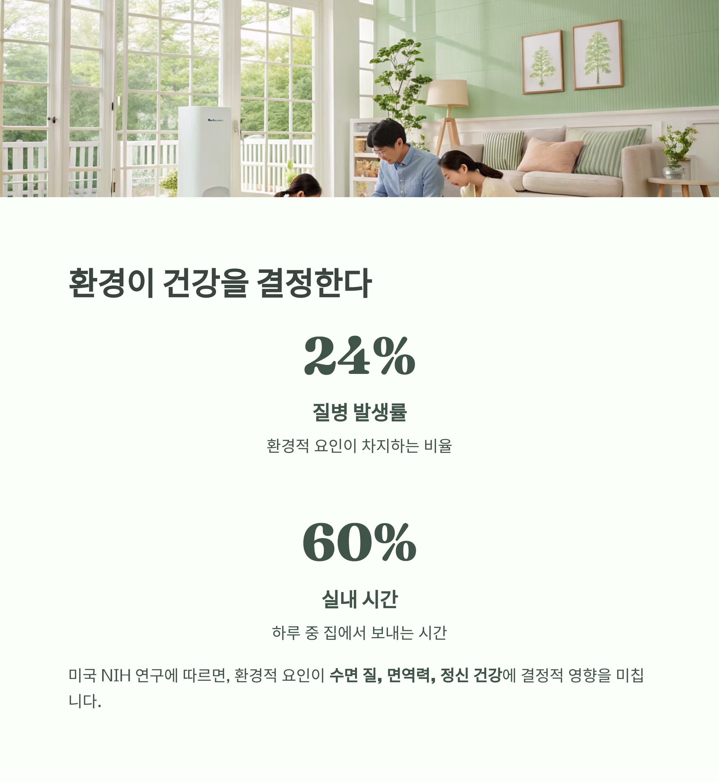 미국 NIH 연구에 따르면, 환경적 요인이 질병 발생률의 24% 이상을 차지한다고 합니다.