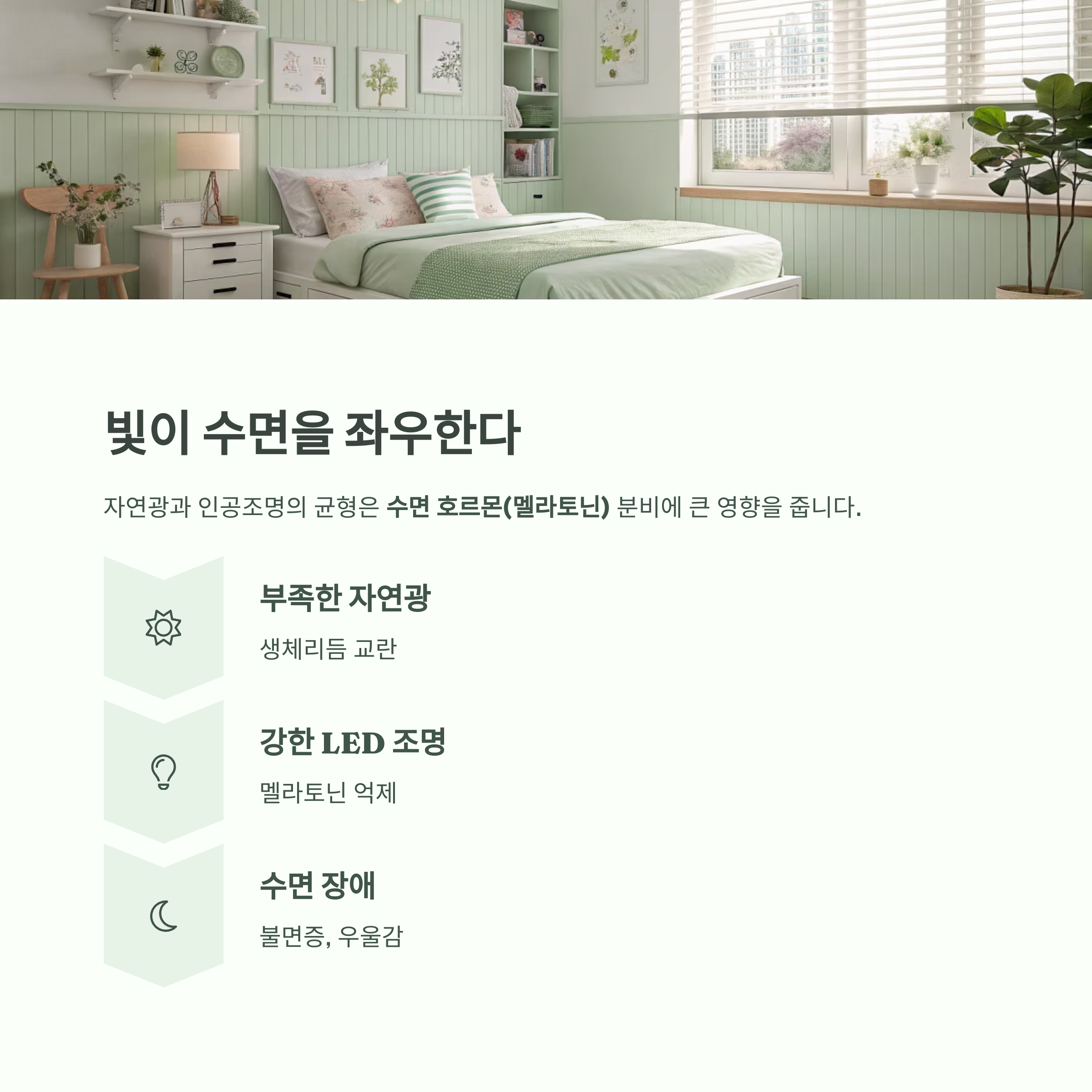 자연광과 인공조명의 균형은 우리의 수면 호르몬(멜라토닌) 분비에 큰 영향을 줍니다.