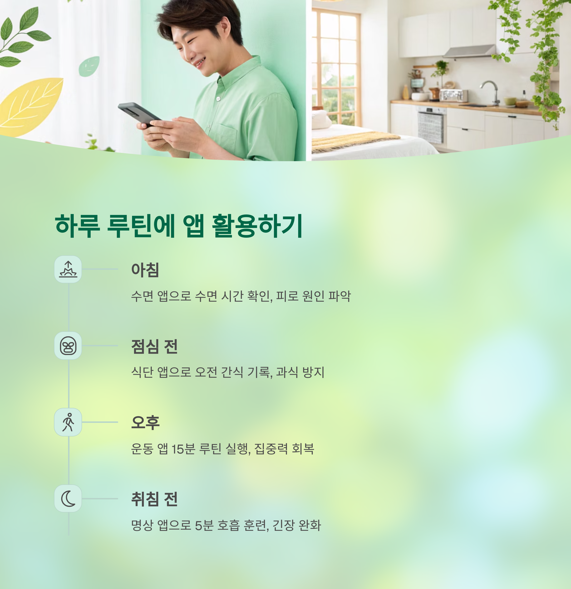 | 아침 | 수면 앱으로 수면 시간 확인 | 피로 원인 파악, 기상 습관 개선 |
