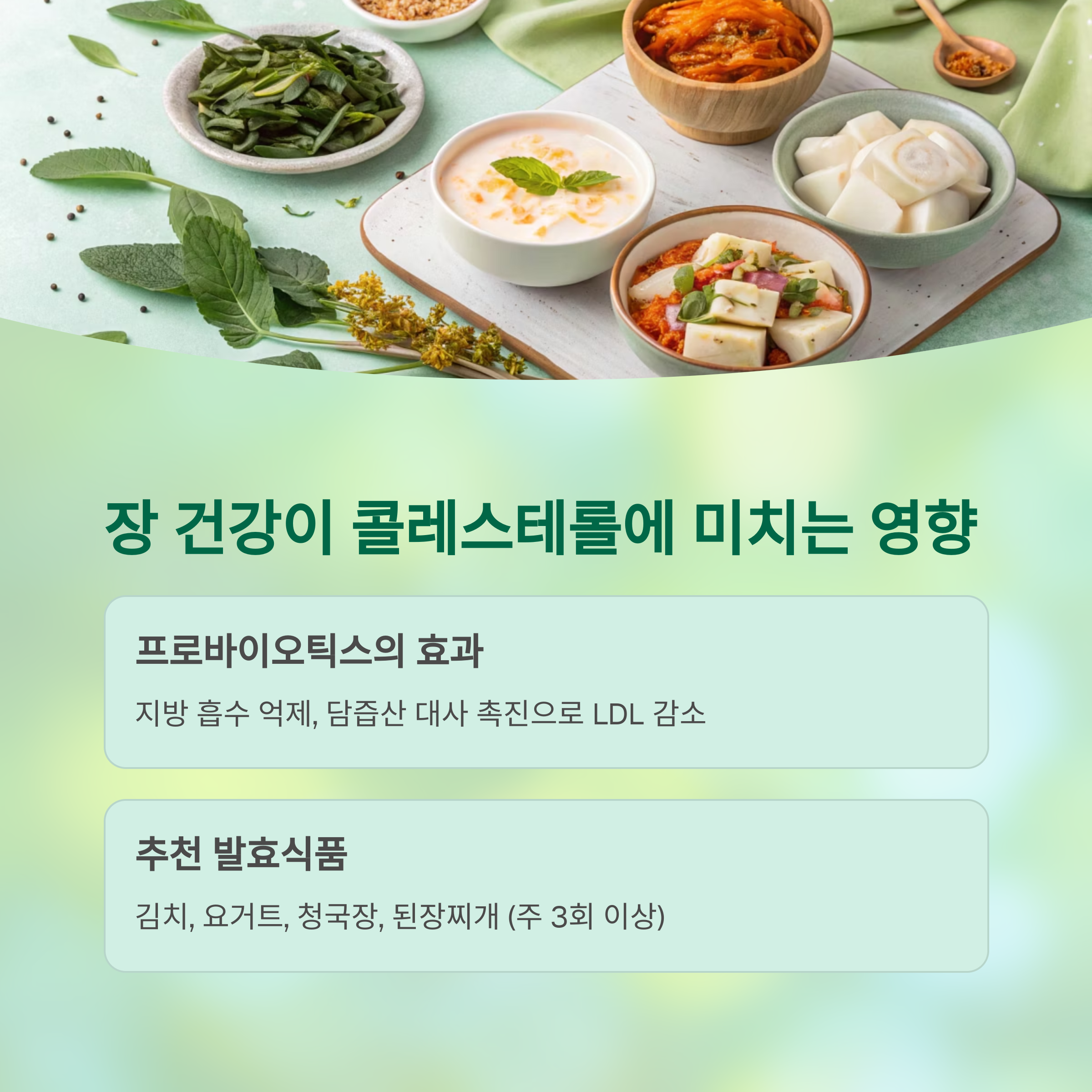 특히 프로바이오틱스가 풍부한 음식은 지방의 흡수를 억제하고, 담즙산 대사를 촉진해 간접적으로 LDL을 낮춥니다