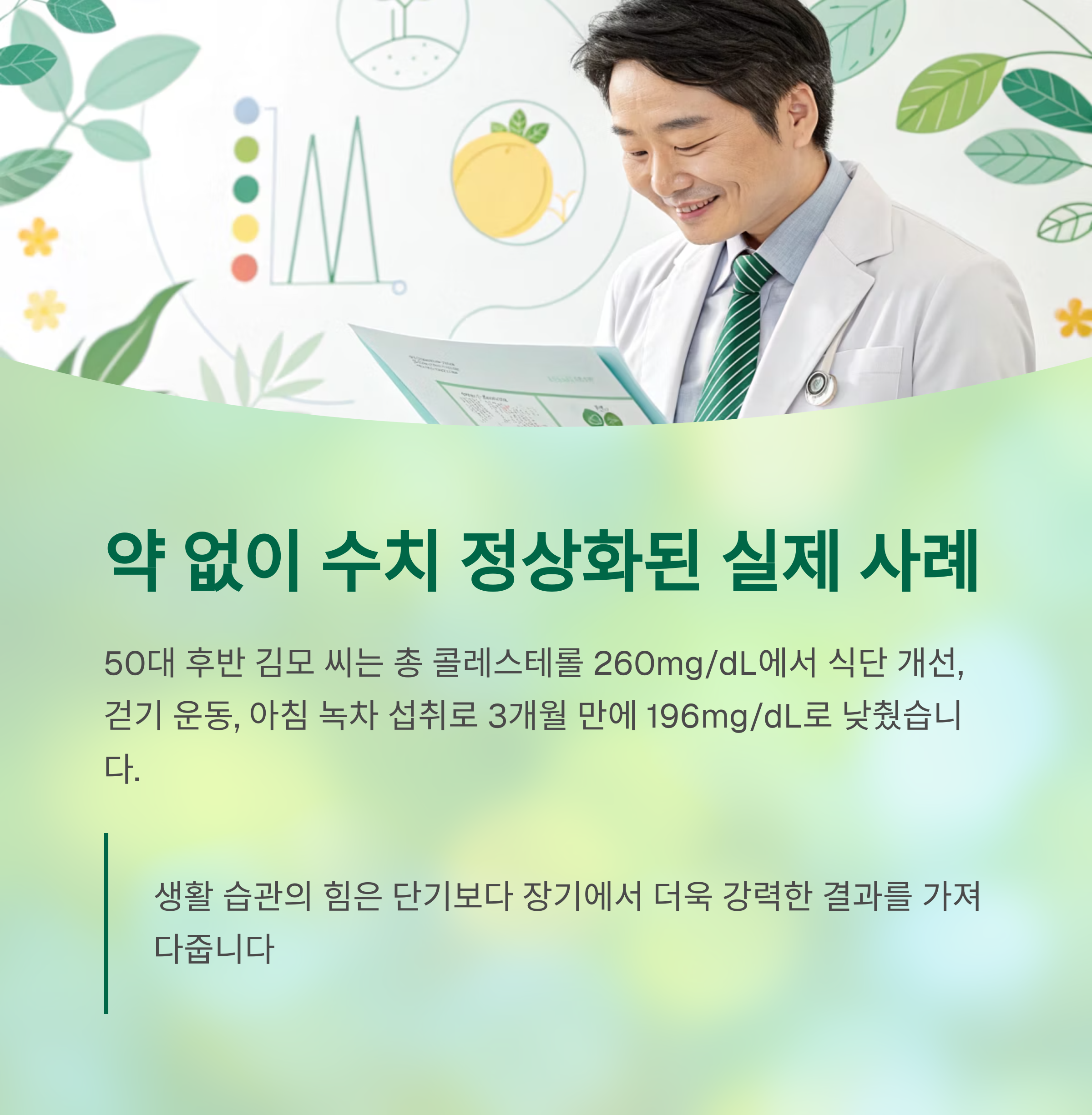 3개월 뒤 재검진에서 수치는 196mg/dL로 떨어졌고, 지금도 약 없이 유지 중입니다"