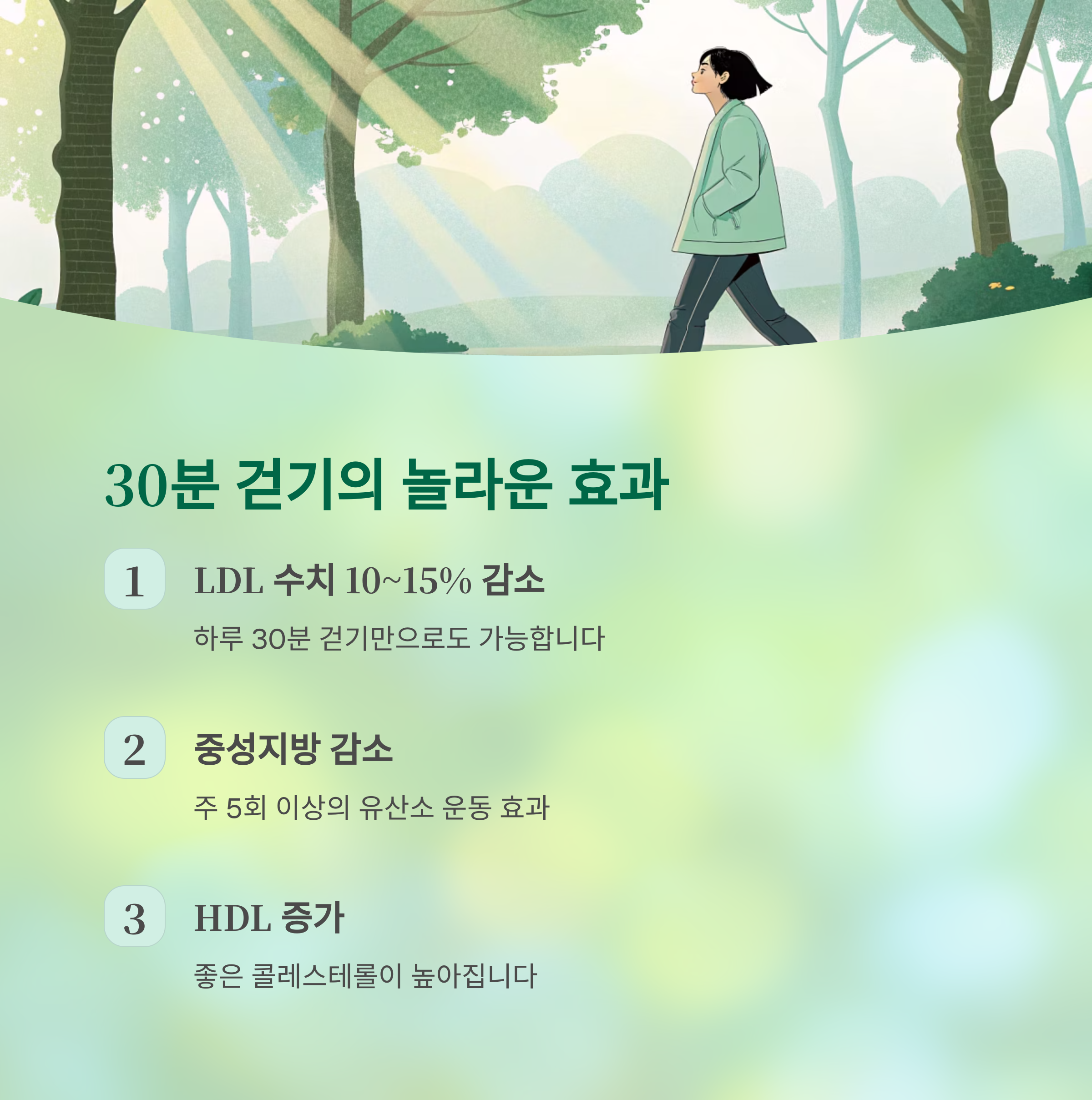 특히 하루 30분 걷기 운동만으로도 LDL 수치가 10~15% 감소한다는 연구가 있습니다