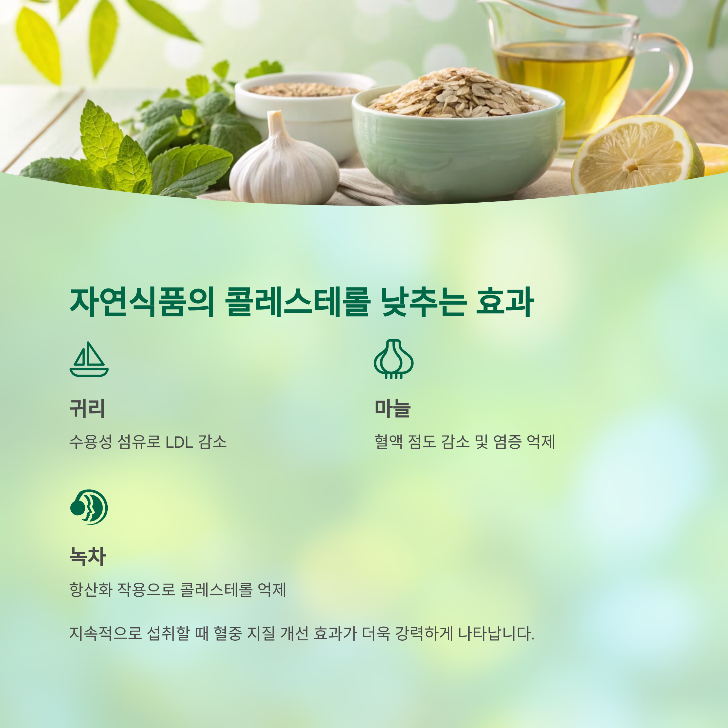 이 식품들은 지속적으로 섭취할 때 혈중 지질 개선 효과가 더욱 강력하게 나타납니다