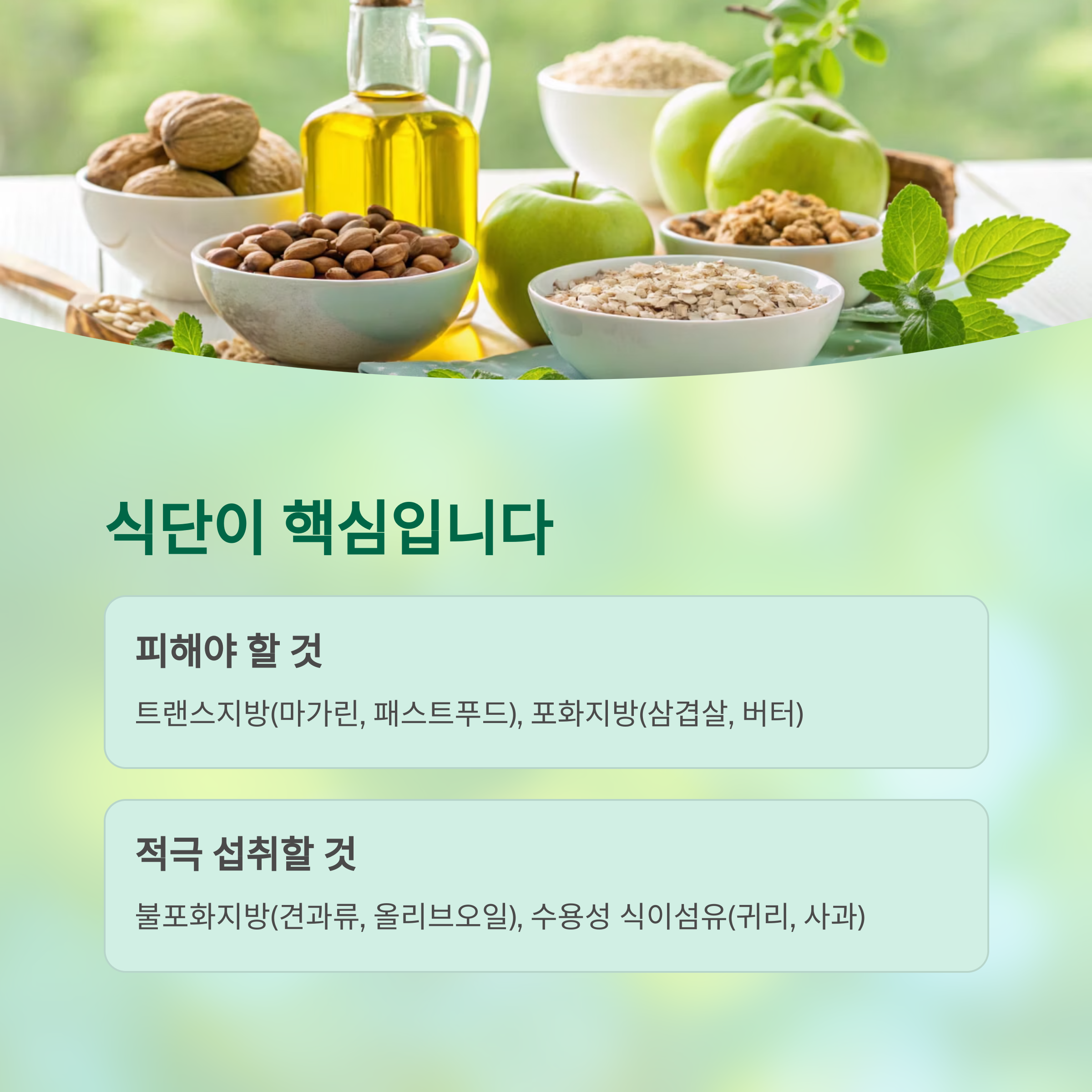 생활습관과 식단의 작은 변화만으로도 고지혈증은 충분히 자연 개선이 가능합니다