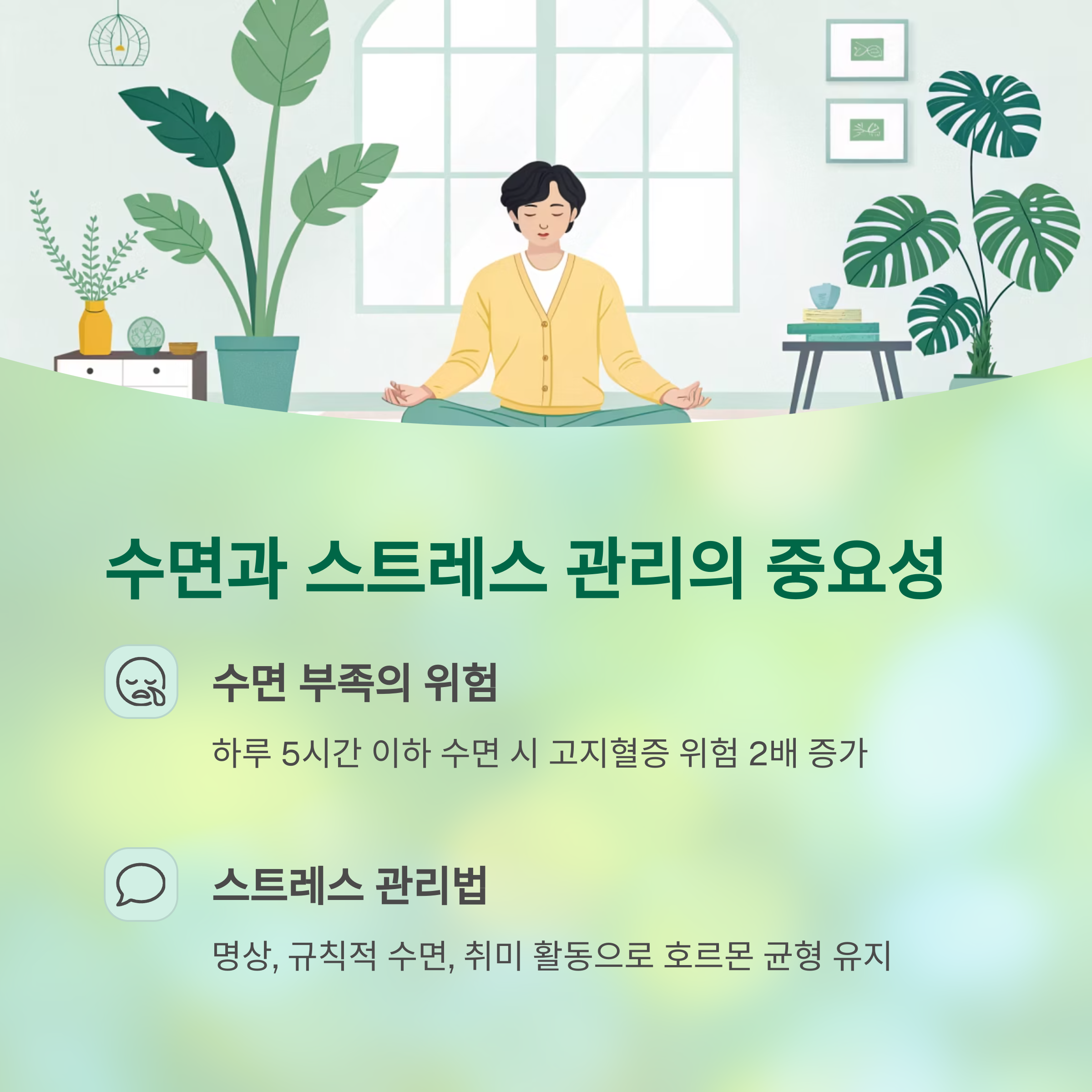 | 스트레스 관리 | 일일 15분 이상 명상 등 | 호르몬 안정, 수면 질 향상 |