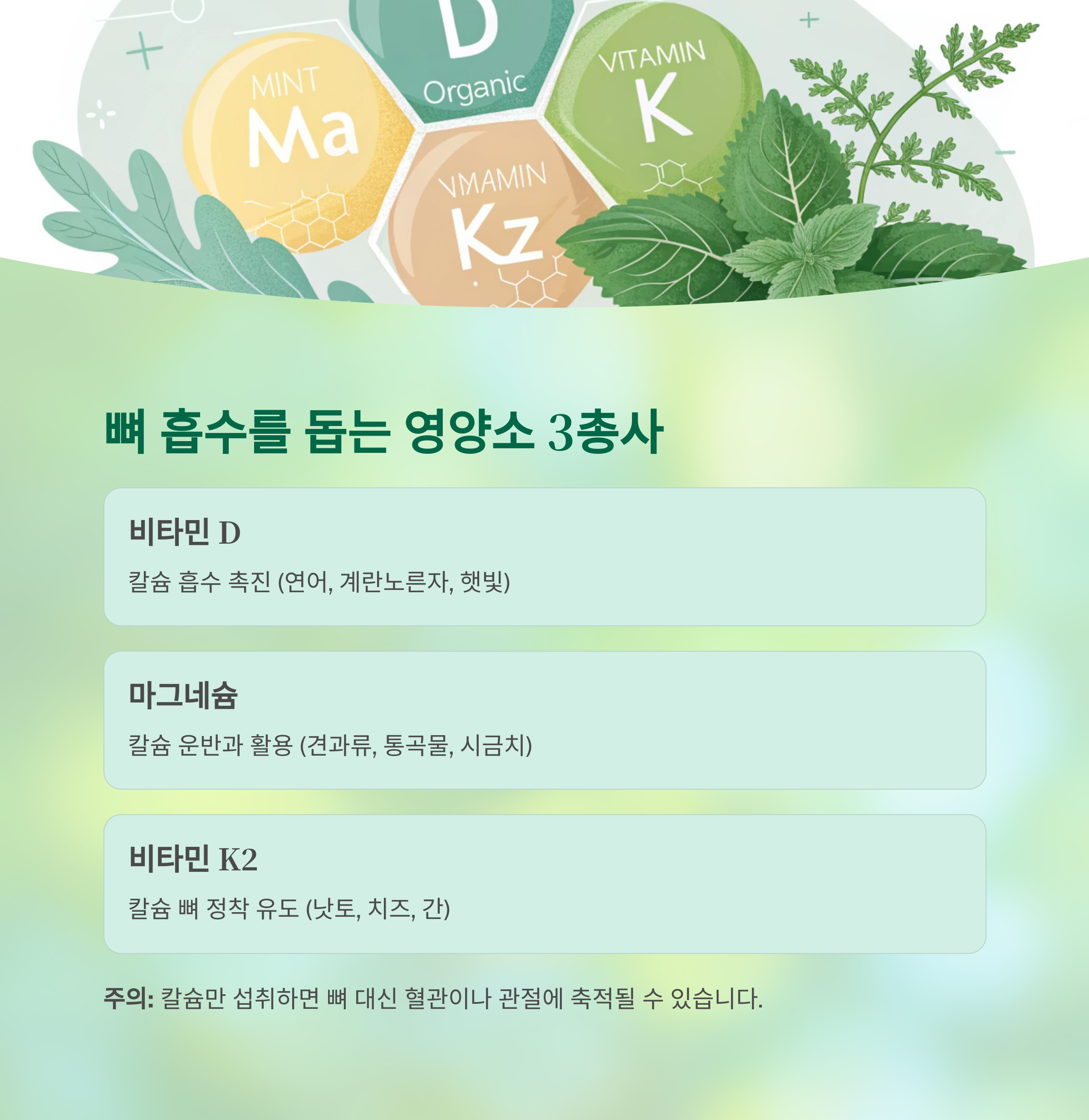 비타민 D는 칼슘 흡수를 촉진하며, 마그네슘은 칼슘의 운반과 활용을 돕습니다.