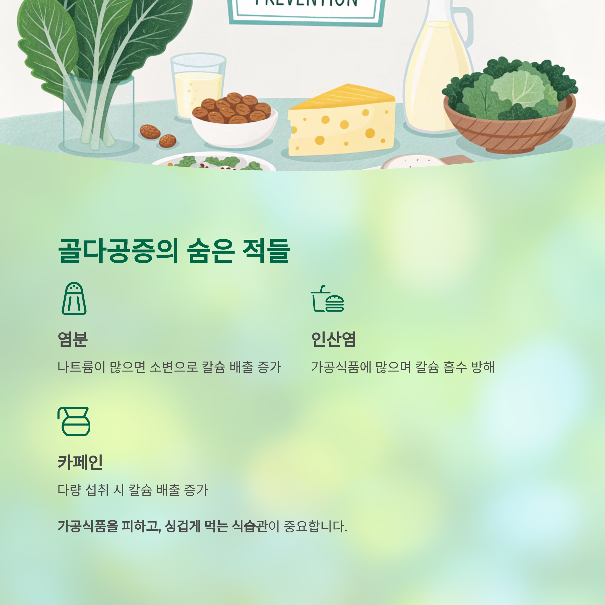 - 염분: 나트륨이 많으면 소변을 통해 칼슘이 빠져나갑니다