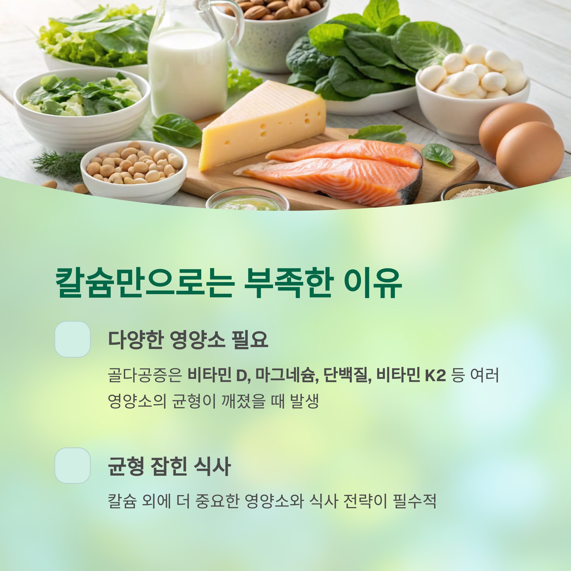 칼슘 섭취만으로는 부족하며, 다양한 영양소와 식습관 개선이 중요합니다.