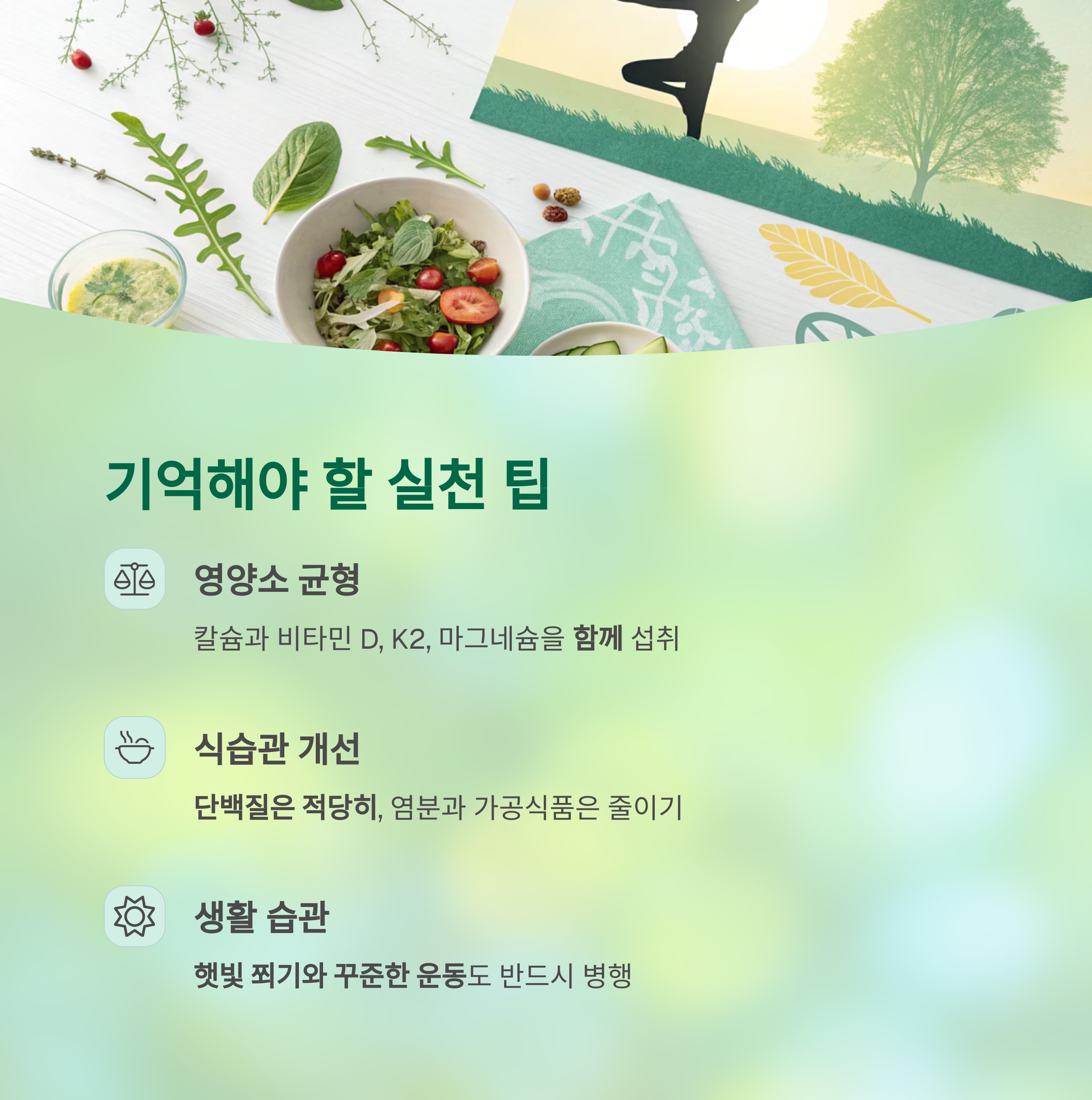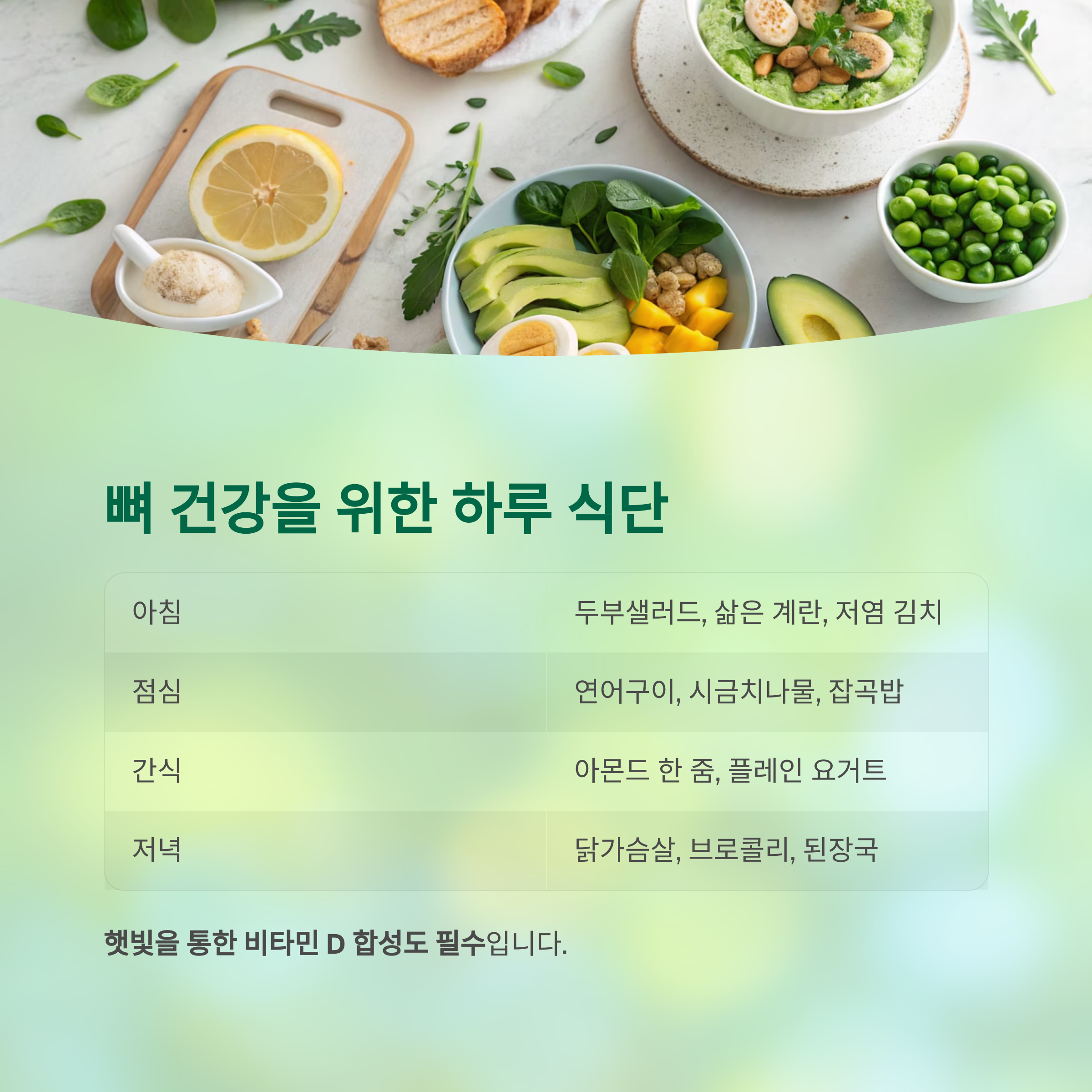 | 간식 | 아몬드 한 줌, 플레인 요거트 | 칼슘과 비타민 K2 보충 |