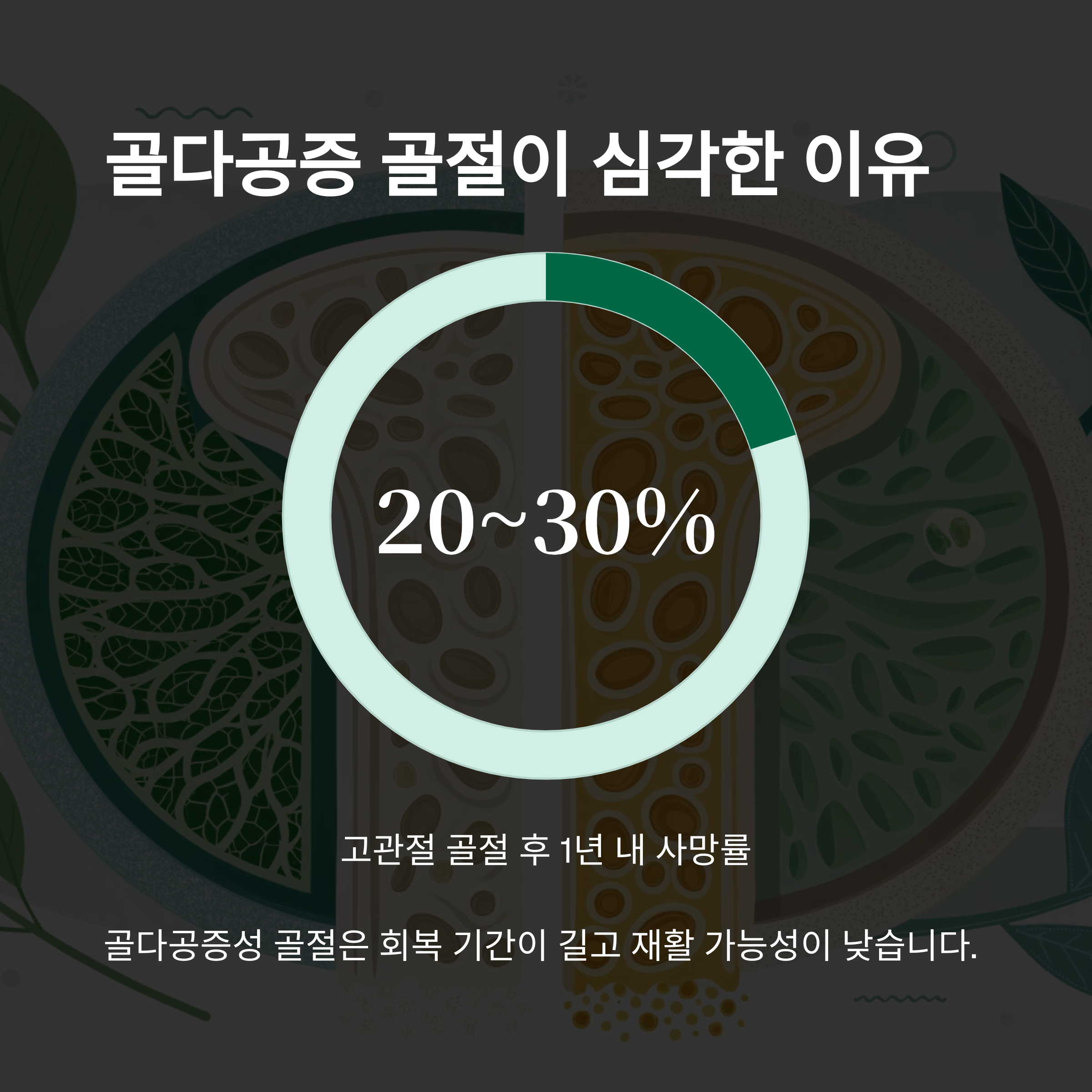 실제로 골절 후 1년 내 사망률은 고관절의 경우 20~30%에 달합니다.