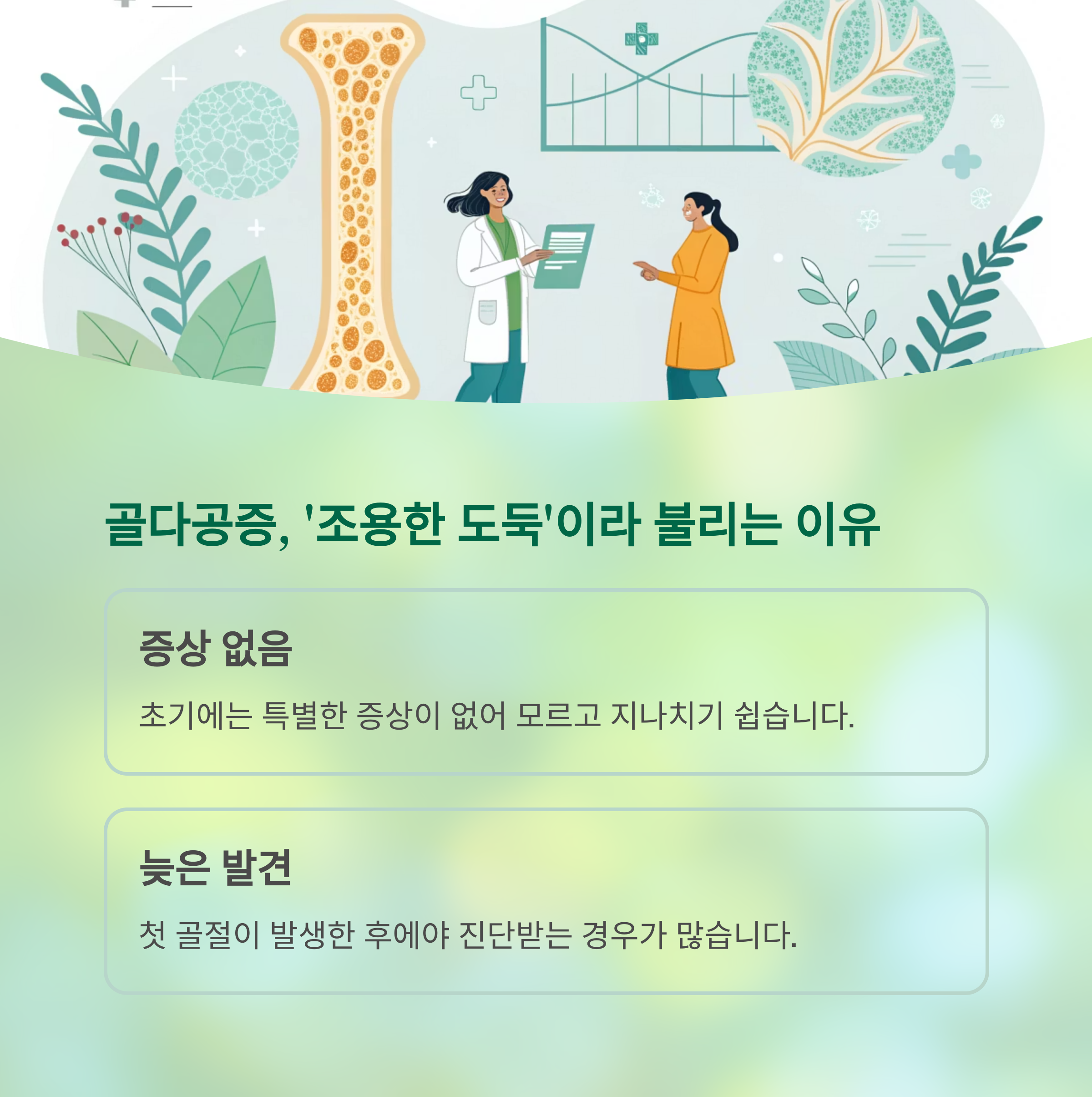 - 무증상 진행: 골절 전까지 아무런 자각 증상이 없음
