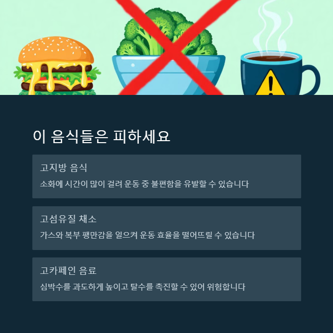 이건 진짜 중요해요. 운동 전에 먹으면 안 되는 음식들! 무심코 먹었다가 위가 불편하거나 운동 효과를 반감시키는 실수, 저도 많이 했거든요. 특히 아래 음식들은 피해 주세요.