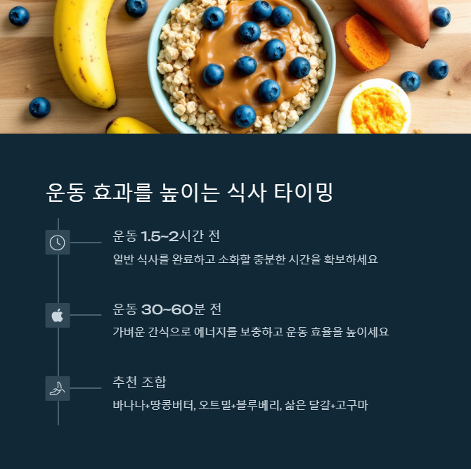 - 가벼운 스낵(바나나, 오트밀 등): 운동 30~60분 전