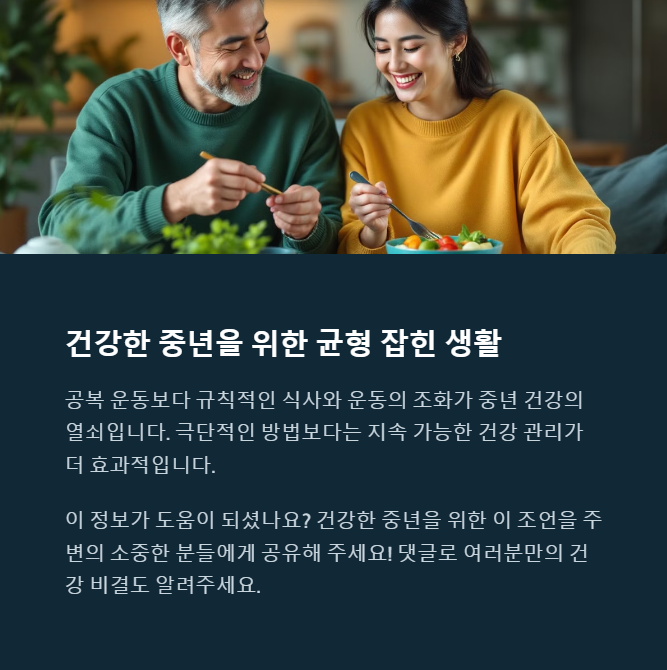이 글이 중년의 건강한 루틴 만들기에 작은 불씨가 되길 바라며, 여러분만의 운동-식사 팁도 댓글로 함께 나눠주세요!