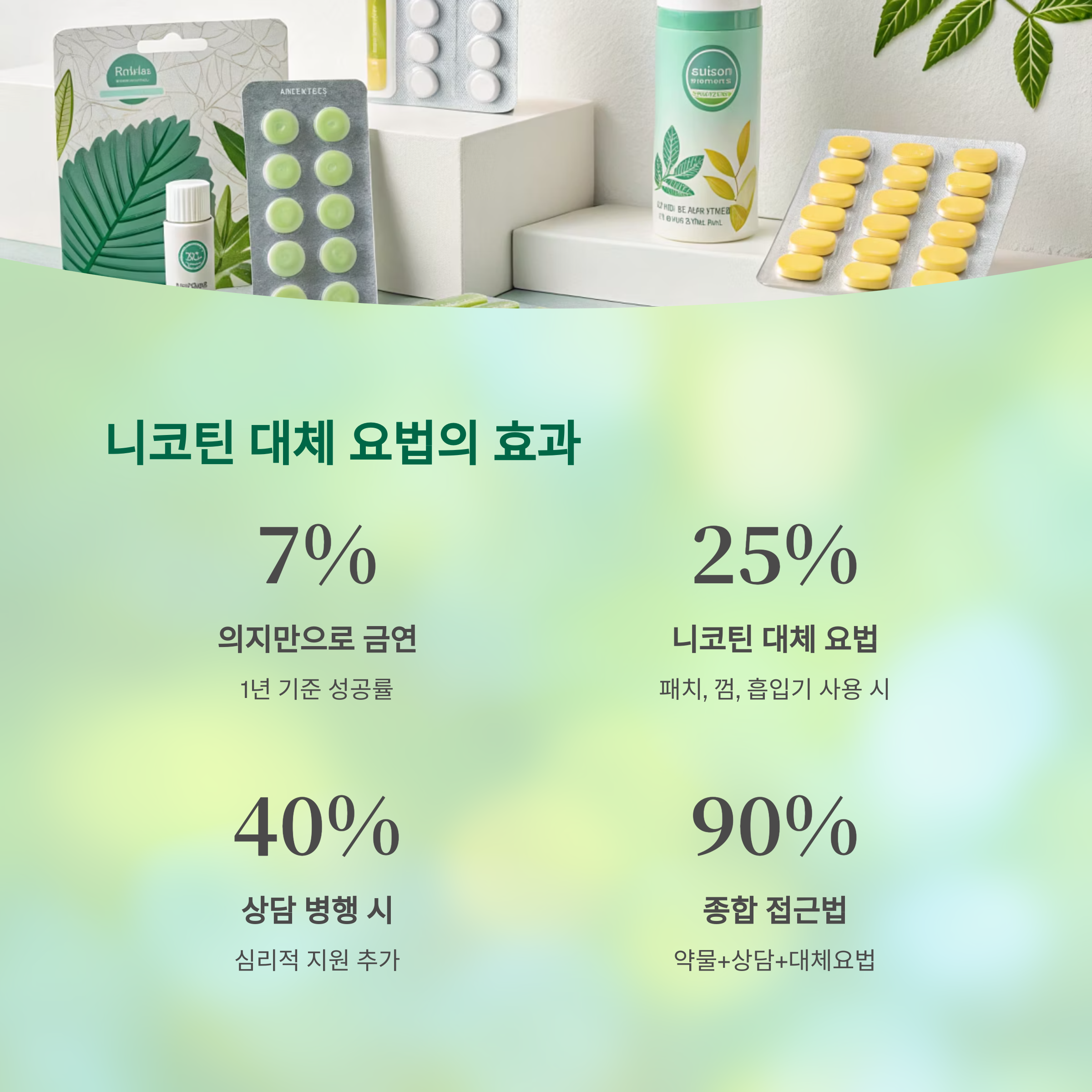| 약물(부프로피온 등) + 상담 + 대체요법 | 최대 88~90% |