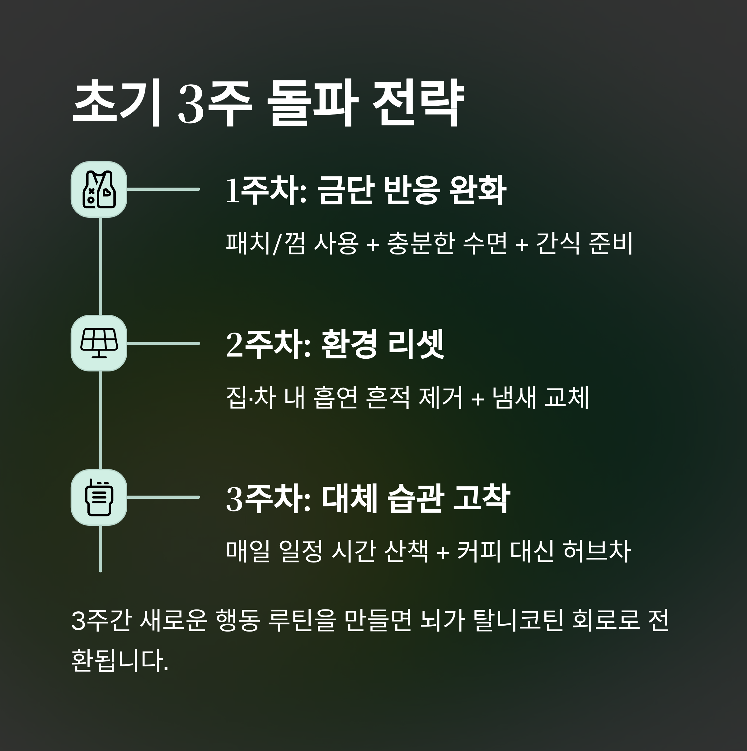 | 1주차 | 금단 반응 완화 | 패치/껌 사용 + 수면 충분 + 간식 준비 |