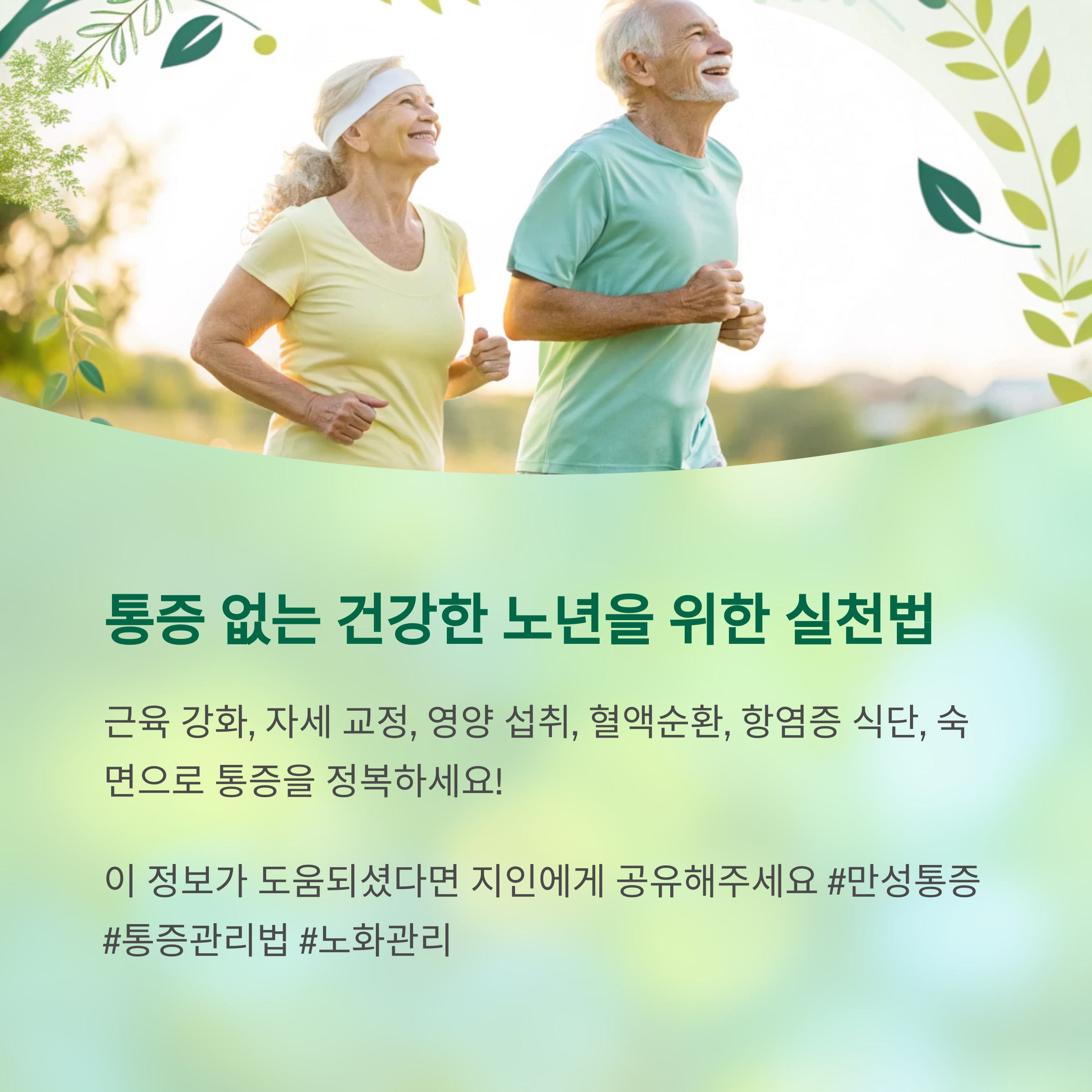 통증은 나이가 들수록 자연스러운 것으로 생각하기 쉽지만, 꾸준한 관리와 생활 습관 개선을 통해 충분히 예방 및 극복할 수 있습니다. 근육 강화 운동과 자세 교정, 적절한 영양 섭취, 혈액순환 촉진, 항염증 식단과 숙면 관리로 통증을 완벽히 정복하세요. 지금부터 적극적으로 관리하면 나이가 들어서도 활기차고 건강한 인생을 누릴 수 있습니다.