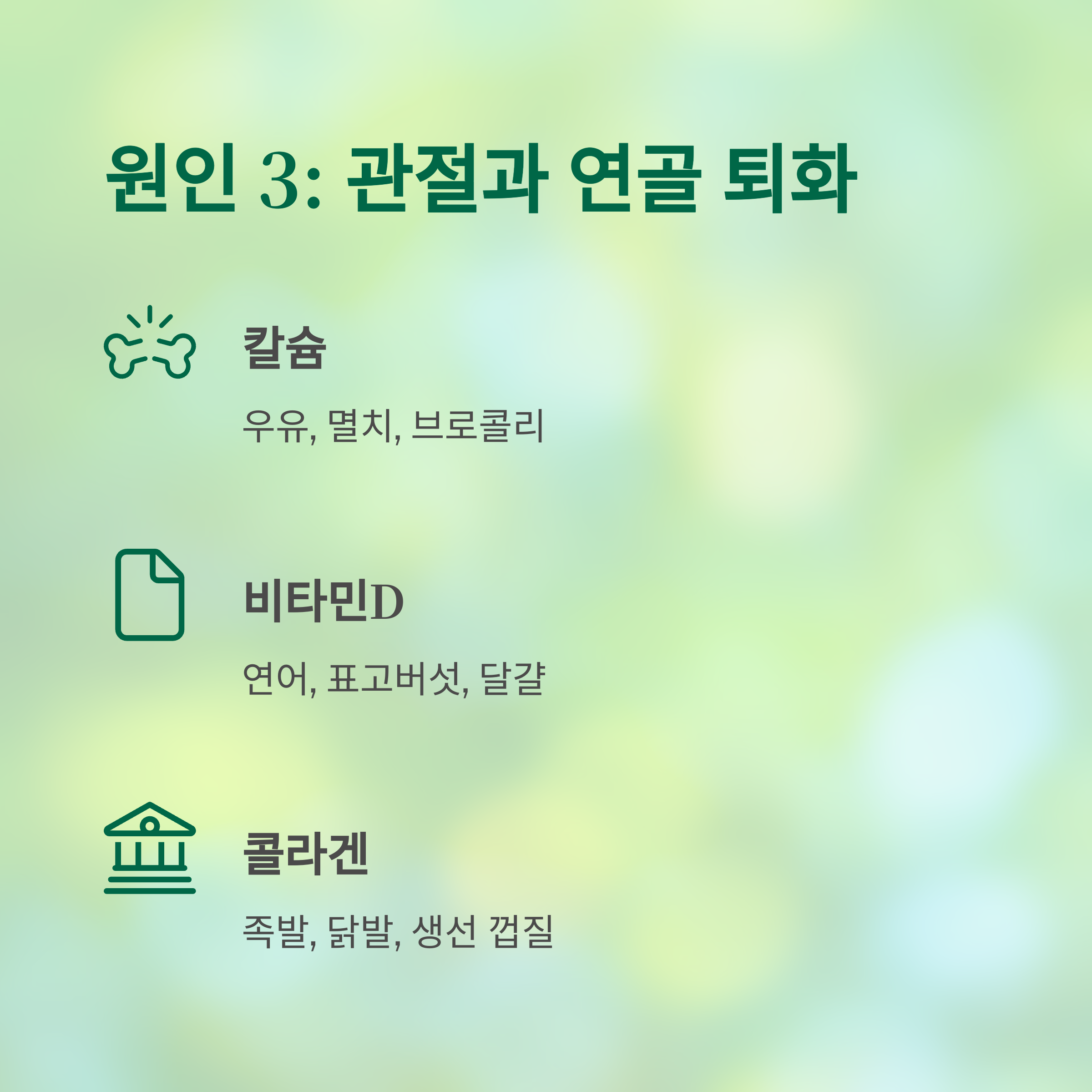 관절과 연골은 나이가 들수록 자연스럽게 닳고 약해집니다. 하지만 이 과정은 적극적인 관리로 충분히 늦출 수 있습니다. 연골에 좋은 영양소인 칼슘, 비타민D, 콜라겐을 꾸준히 섭취하고 관절에 무리를 주지 않는 걷기나 수영 등 저강도 운동을 하면 관절의 퇴화를 최소화하고 통증 없는 일상을 유지할 수 있습니다.