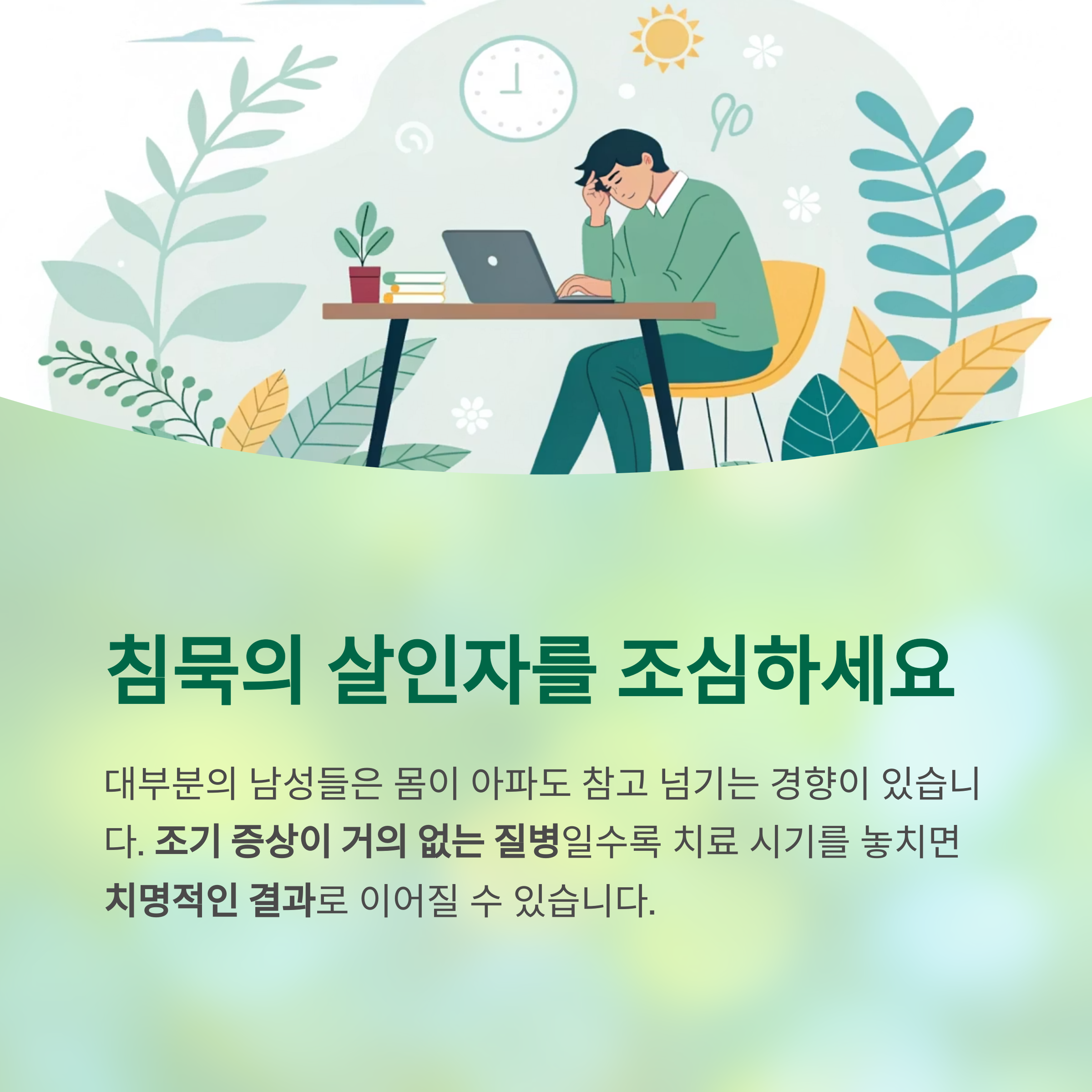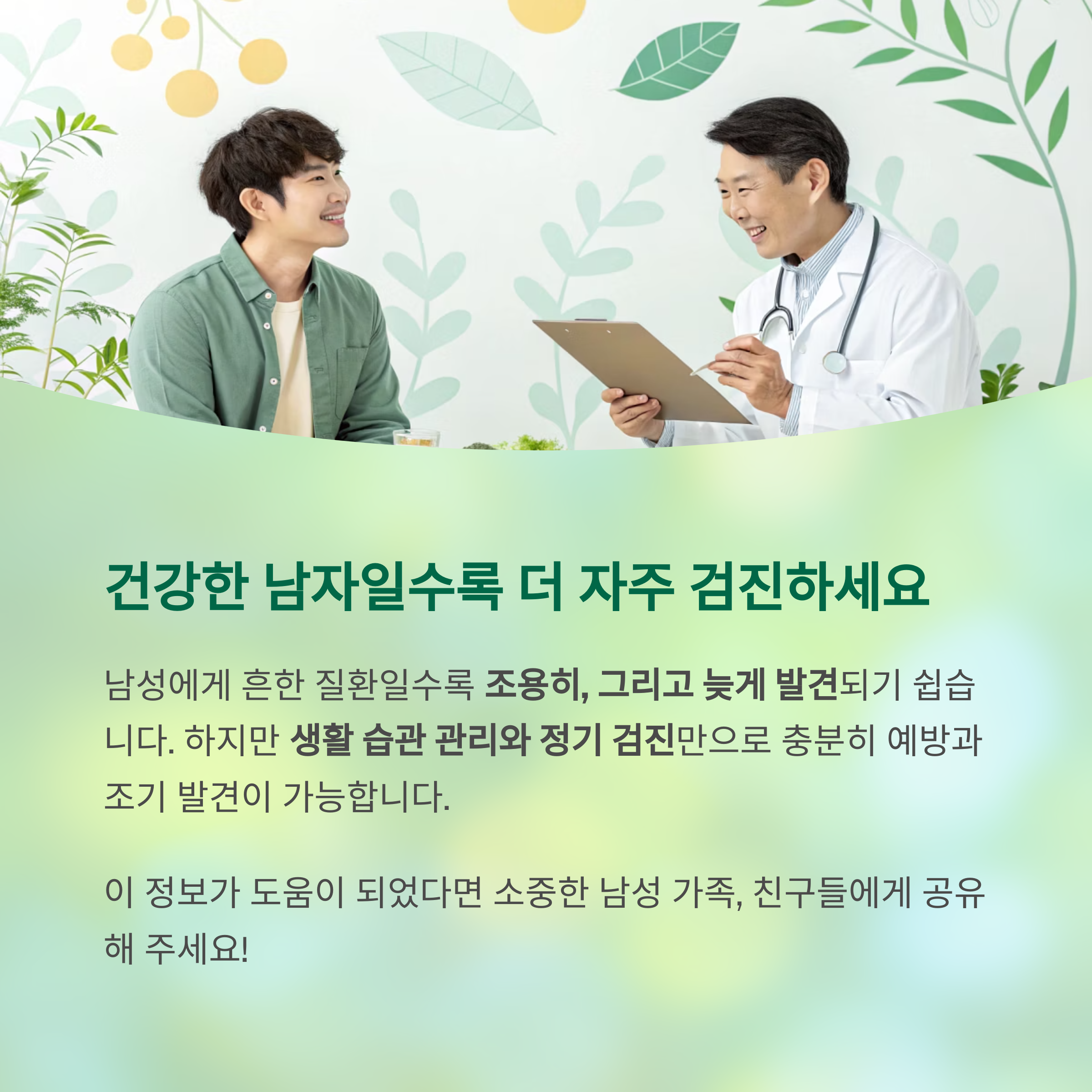 남성에게 흔한 질환일수록 조용히, 그리고 늦게 발견되기 쉽습니다.