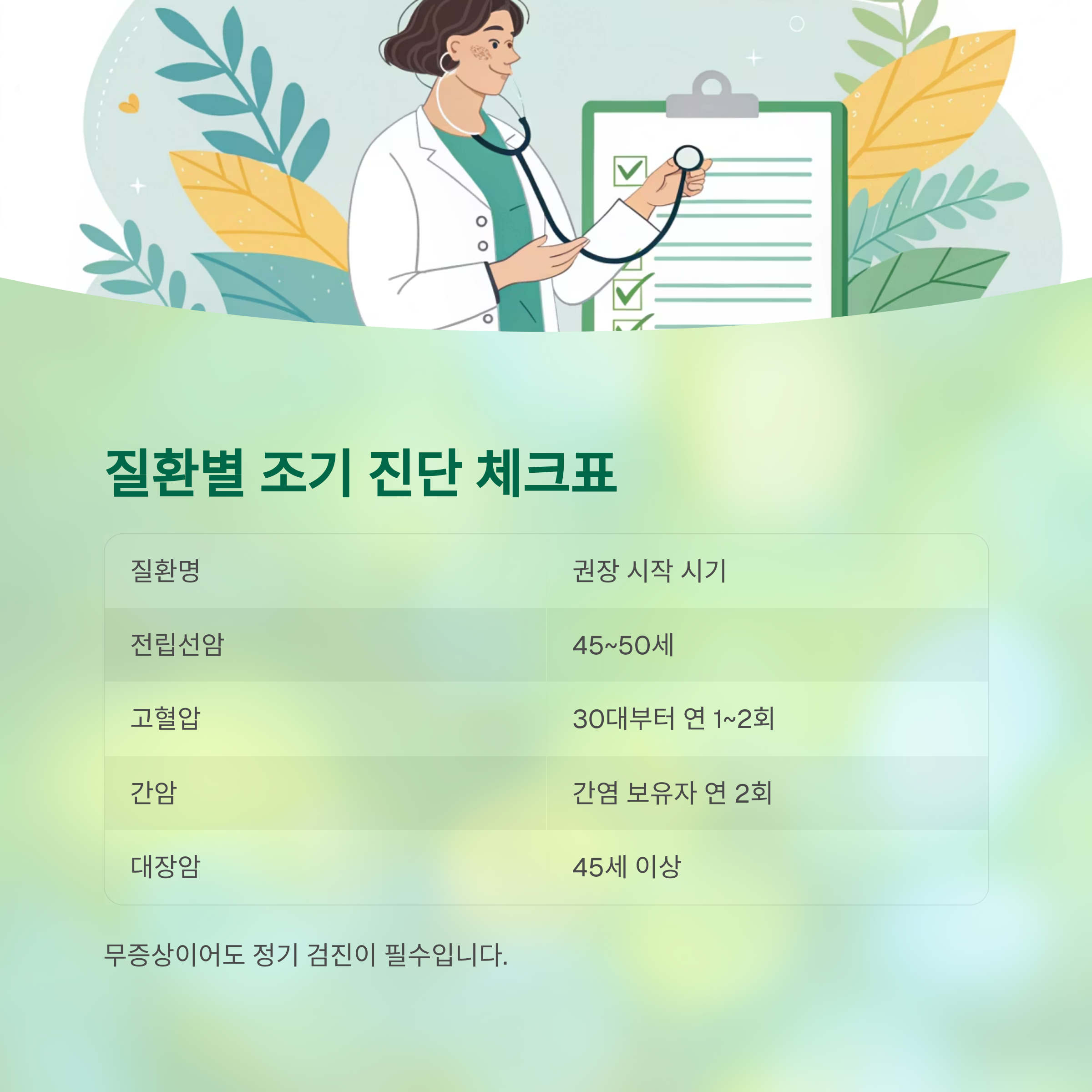 | 대장암 | 분변검사, 대장내시경 | 45세 이상 | 가족력 있다면 더 일찍 |