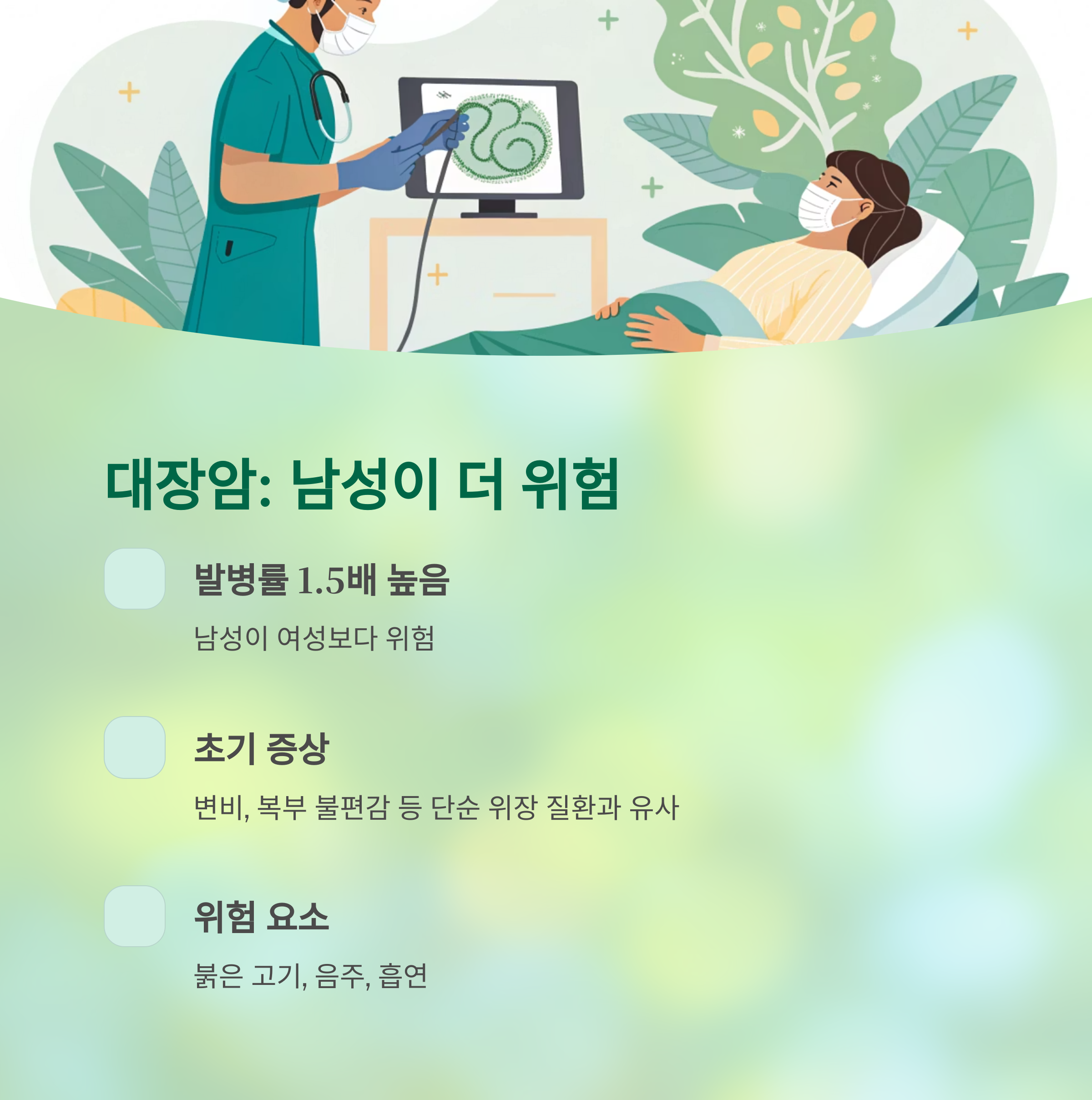 대장암: 남성이 여성보다 1.5배 높은 발병률