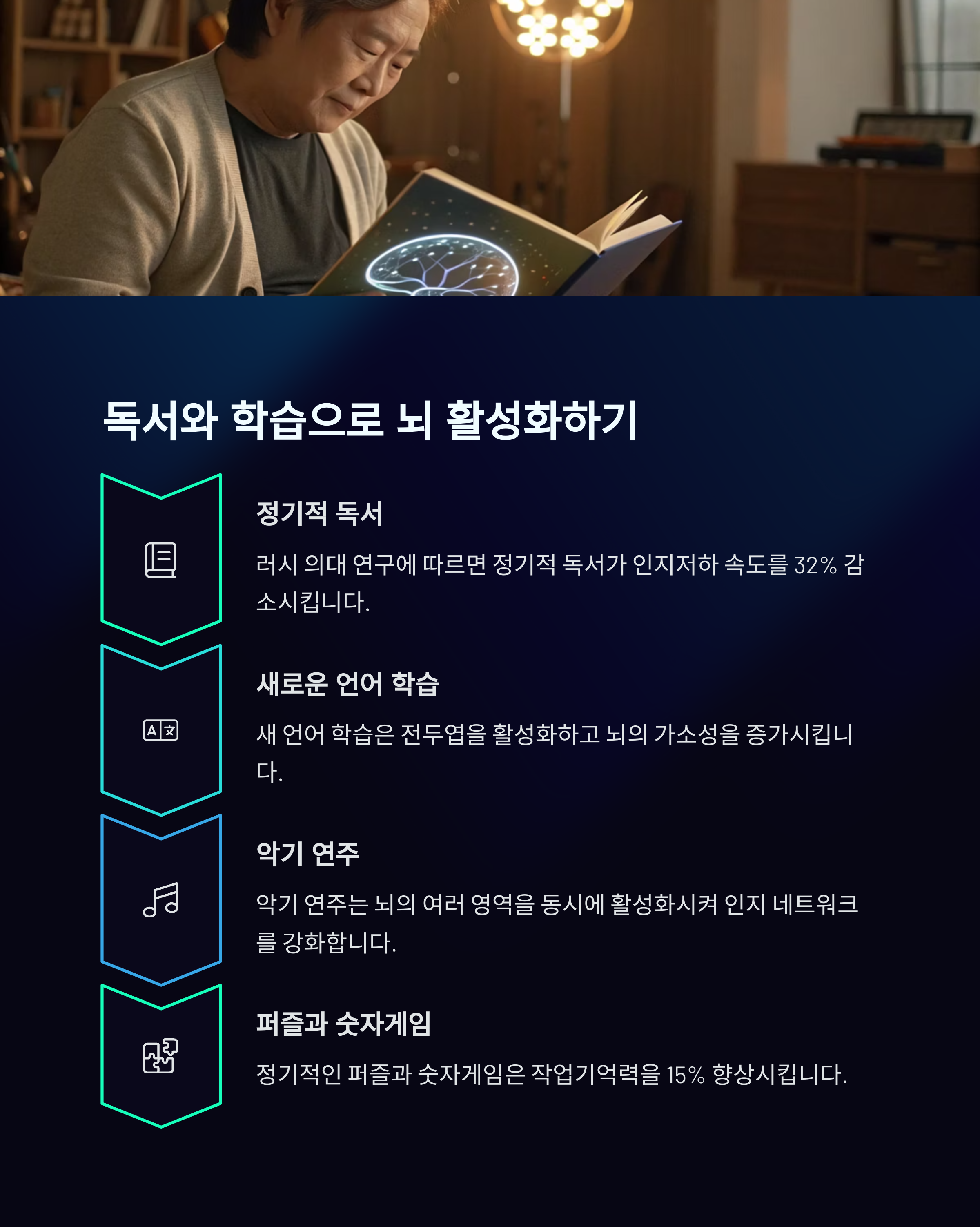 책 읽기, 새로운 기술 배우기, 외국어 공부는 뇌를 활발하게 만듭니다.