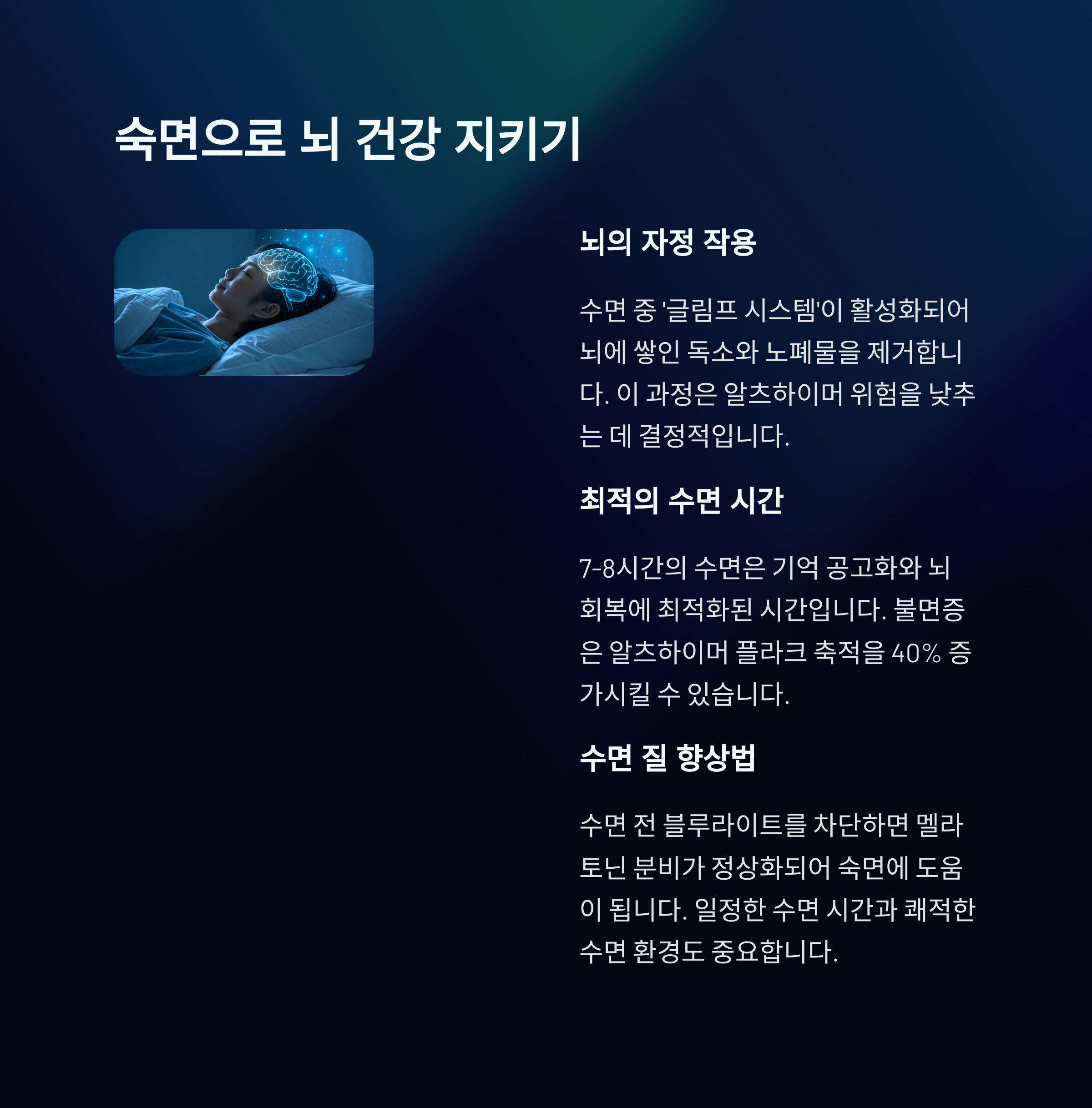 규칙적이고 충분한 수면으로 뇌를 보호하세요.