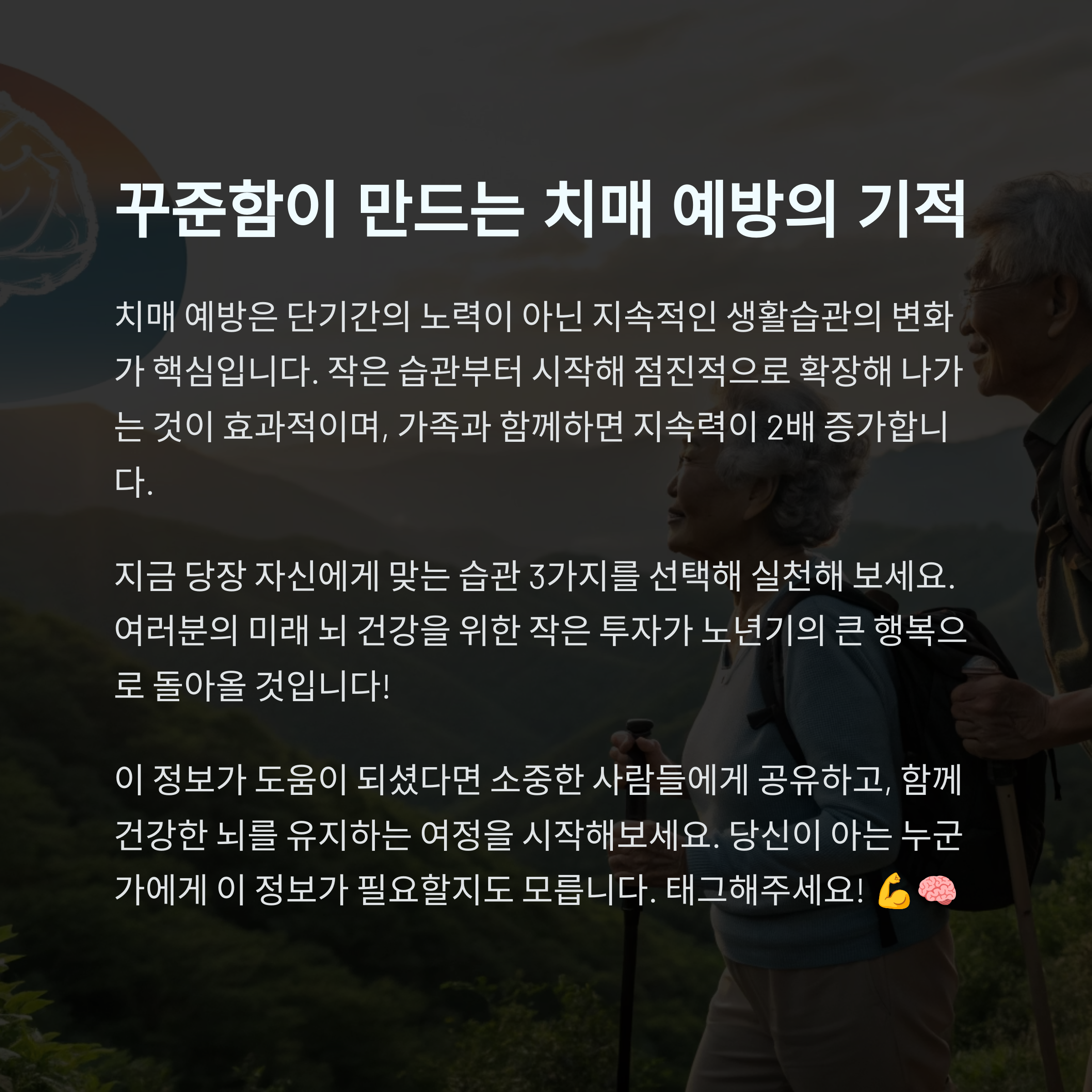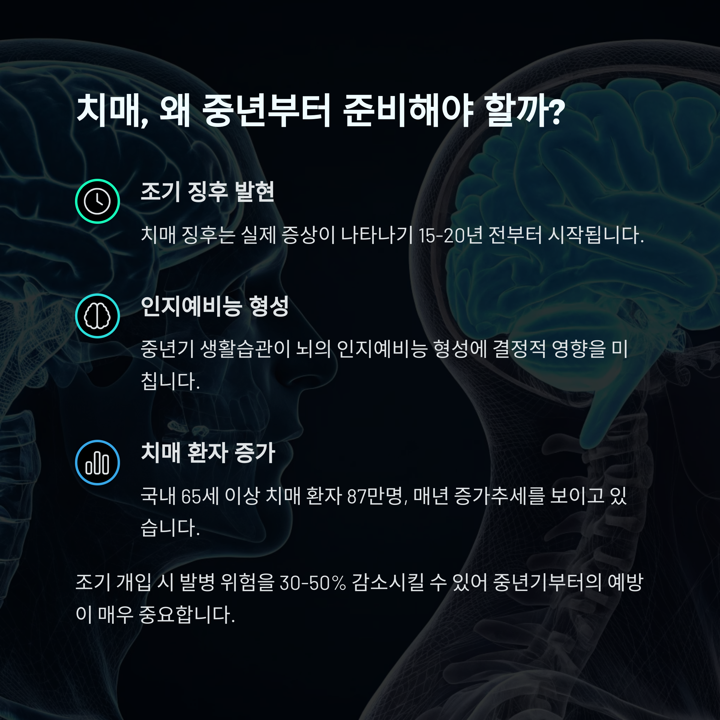 "40대부터 관리하는 뇌 건강"이 치매 예방의 핵심입니다.